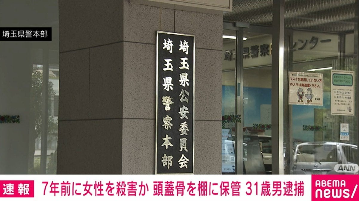 7年前、さいたま市の自宅で当時21歳の女性を首を絞めて殺害したとして31歳の男が逮捕されました。男は自室の棚に女性の頭蓋骨を保管していました。