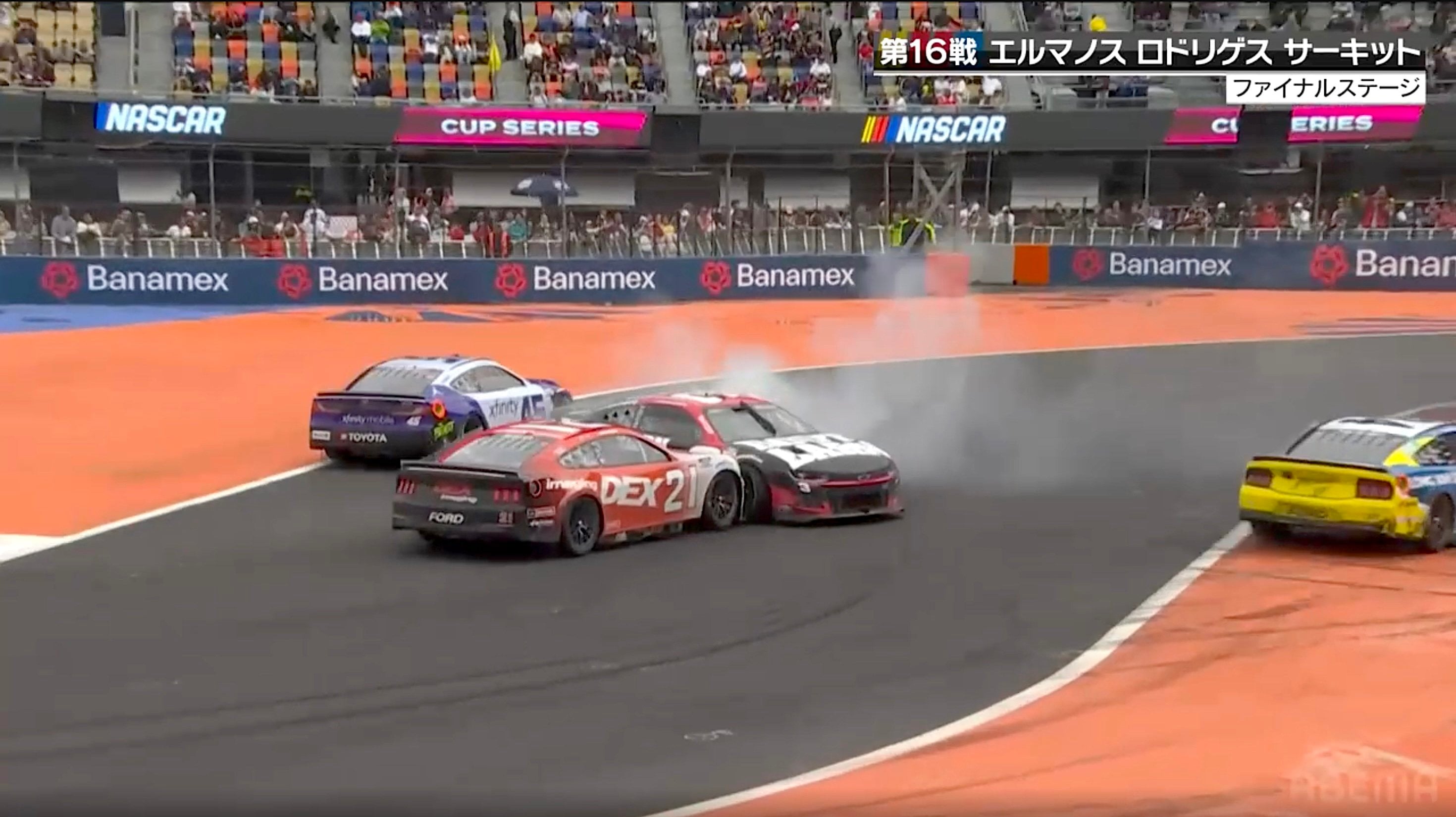 北米で人気のストックカーレース、NASCAR(ナスカー)の第16戦がメキシコで開催された。レース終盤、スピンしてコース上に停車したシボレーのマシンに、フォードのマシンが真横から突っ込んでしまった。