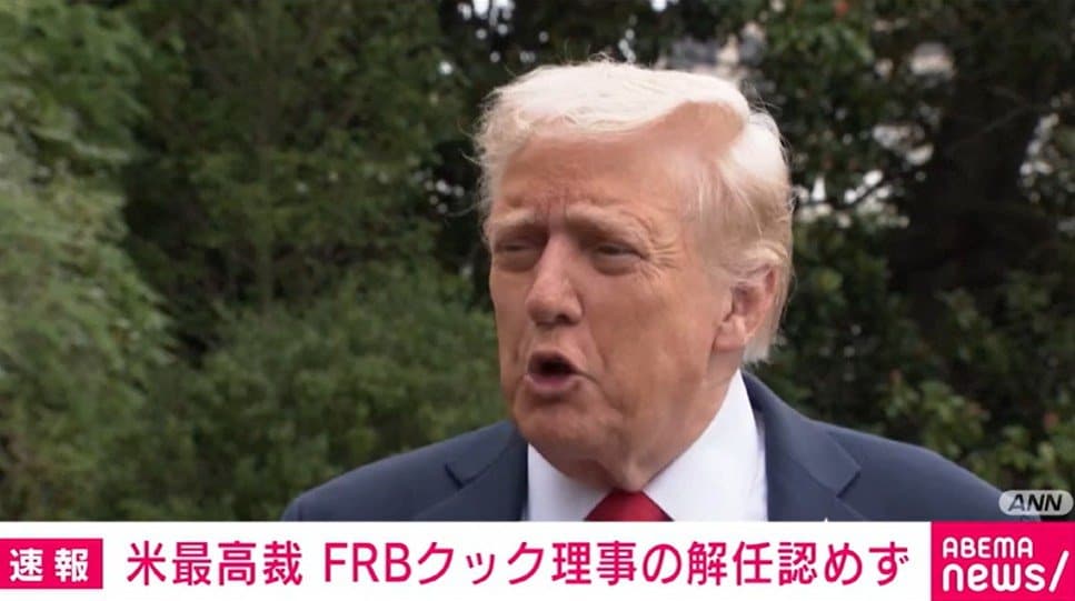 アメリカ連邦最高裁は、トランプ大統領が求めていたFRB(=連邦準備制度理事会)のクック理事の即時解任を認めないとの判断を示しました。