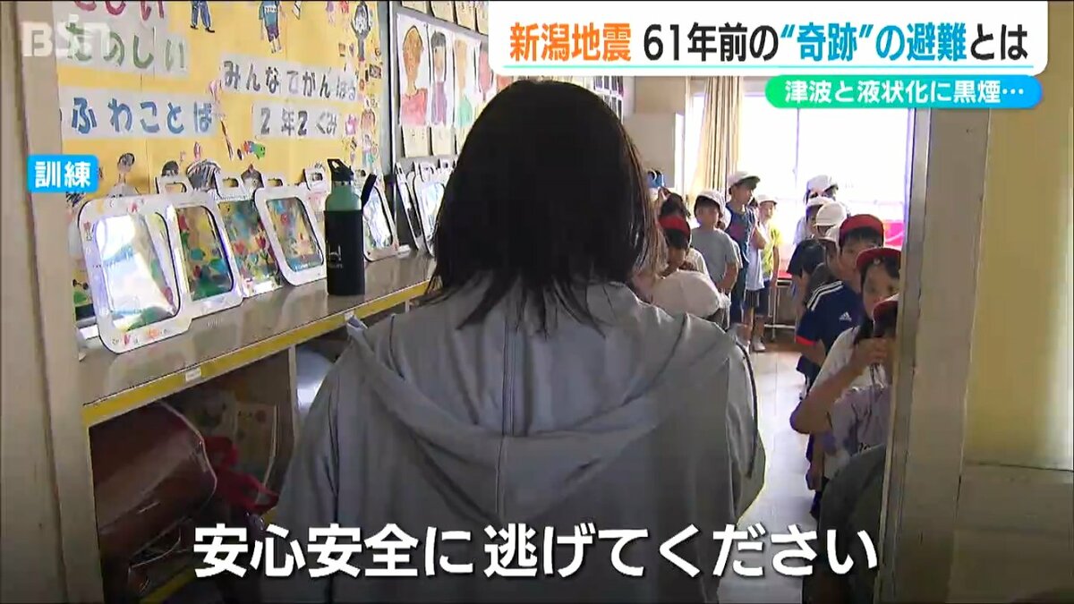 新潟地震から61年たったこの日、新潟地震の発生時刻である午後1時1分に合わせて行われた訓練では、津波警報が発表されたという想定で1階と2階の教室にいる児童が3階以上へ垂直避難しました。