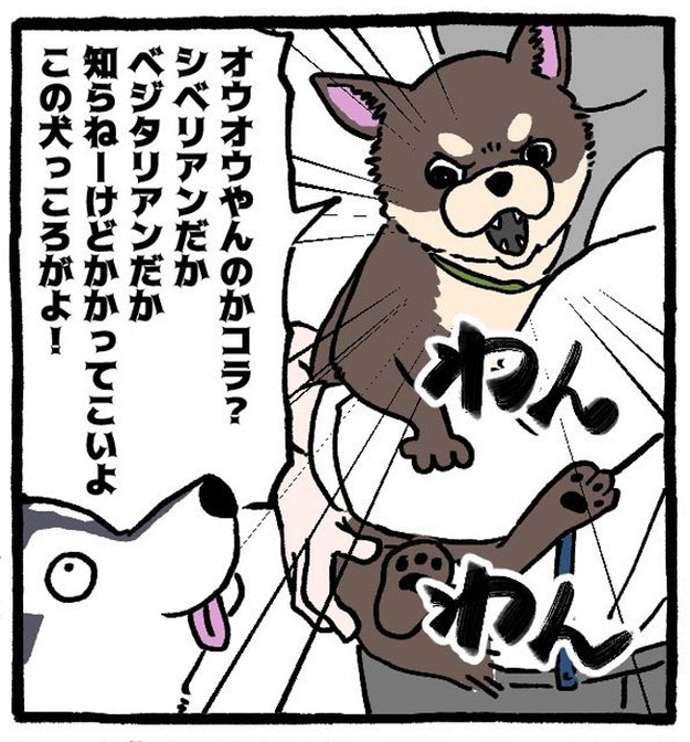 1本目の漫画は飼い主さんに抱っこされ、大型犬・シベリアンハスキーに対して「オウオウやんのかコラ?」と強気な表情と言葉でケンカを売る、1匹のチワワの姿から始まります。