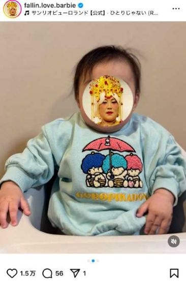 昨年8月に長女を出産したバービーは、「ふとスマホに入っていた昔の写真を見返していたら、30年以上の時を経てゴロピカドンで娘とタイムリングコーデしてた」とコメント。サンリオキャラクター「ゴロピカドン」のトレーナーを着た自身の幼少期の写真を投稿した。