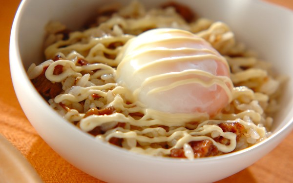 焼き鳥缶とご飯を混ぜて、温泉卵とたっぷりのマヨネーズをON! 焼き鳥缶の甘辛味に温泉卵をからめて食べると最高です。包丁を使わず、たった5分のスピード調理が叶います。忙しい日のランチにも良いですね。