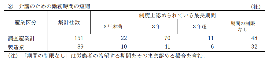 なお、1日の就業時間のうち短縮が認められる時間は、全体、製造業ともに平均2.5時間となっている。これにより、介護と仕事の両立において一定の時間的余裕を確保できる環境が整いつつあるといえそうだ。