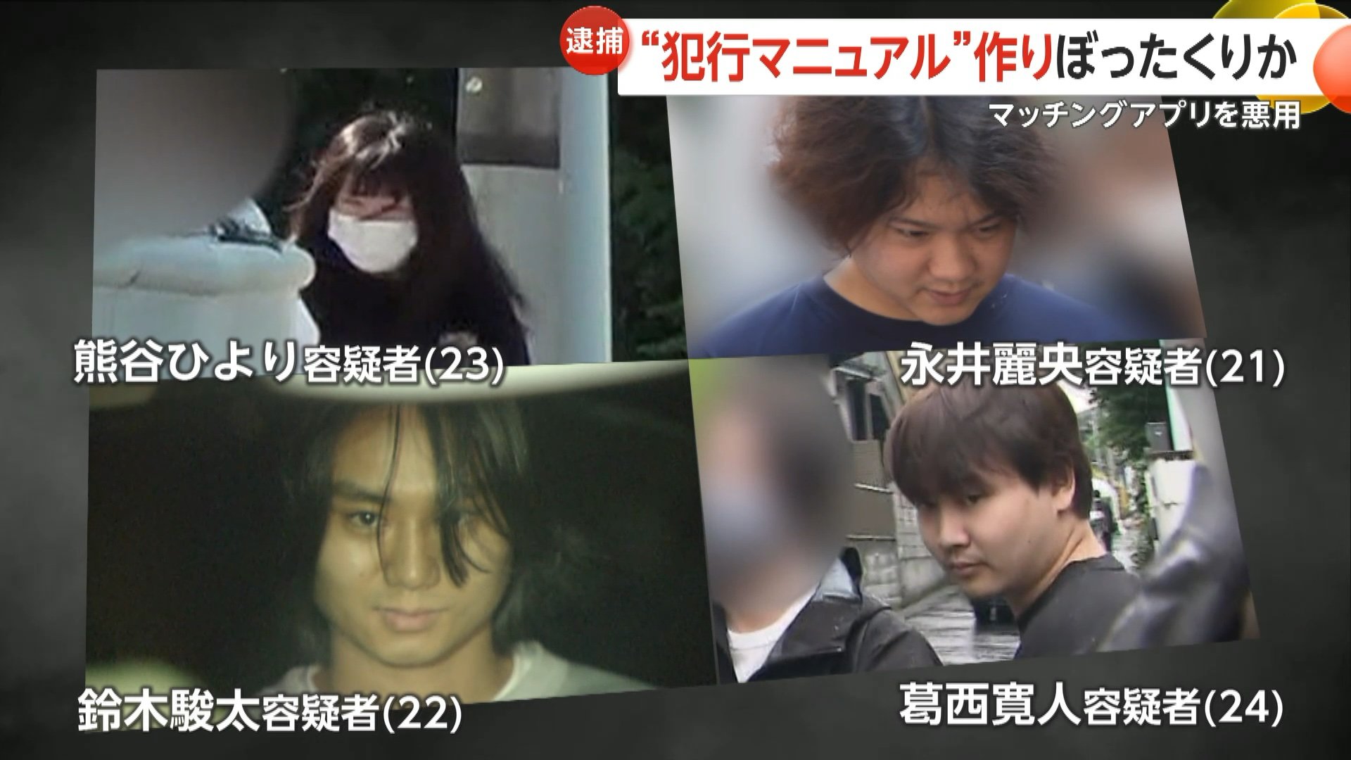 マッチングアプリを悪用し、ぼったくりをくり返すグループの1人で、リーダー格の鈴木駿太容疑者(22)、葛西寛人容疑者(24)、永井麗央容疑者(21)ら5人と共に、詐欺の疑いで逮捕された。