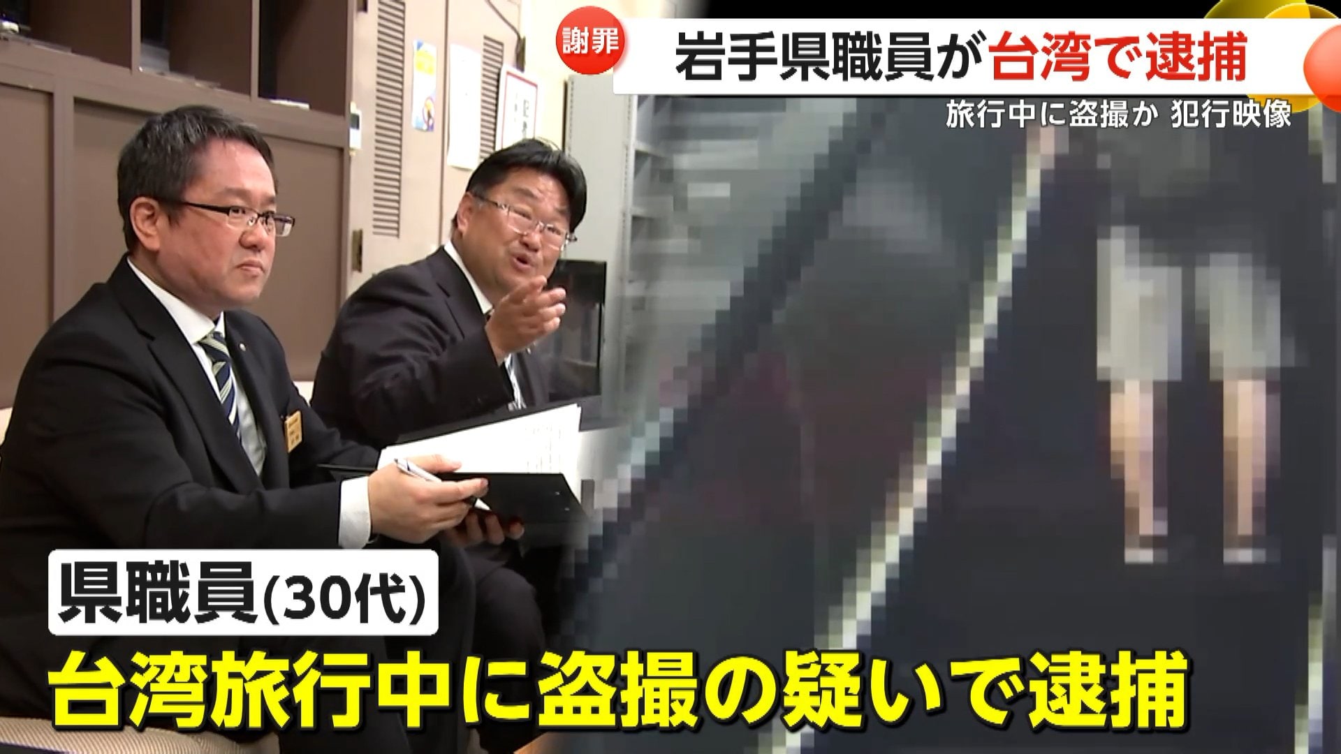 台湾・台北市で、旅行中だった岩手県の30代職員の男が現地時間8日、小型カメラで女性のスカート内を盗撮した疑いで、現地警察に逮捕された。県職員の男は容疑をおおむね認めており、岩手県は18日会見で謝罪し、処分を検討するとしている。