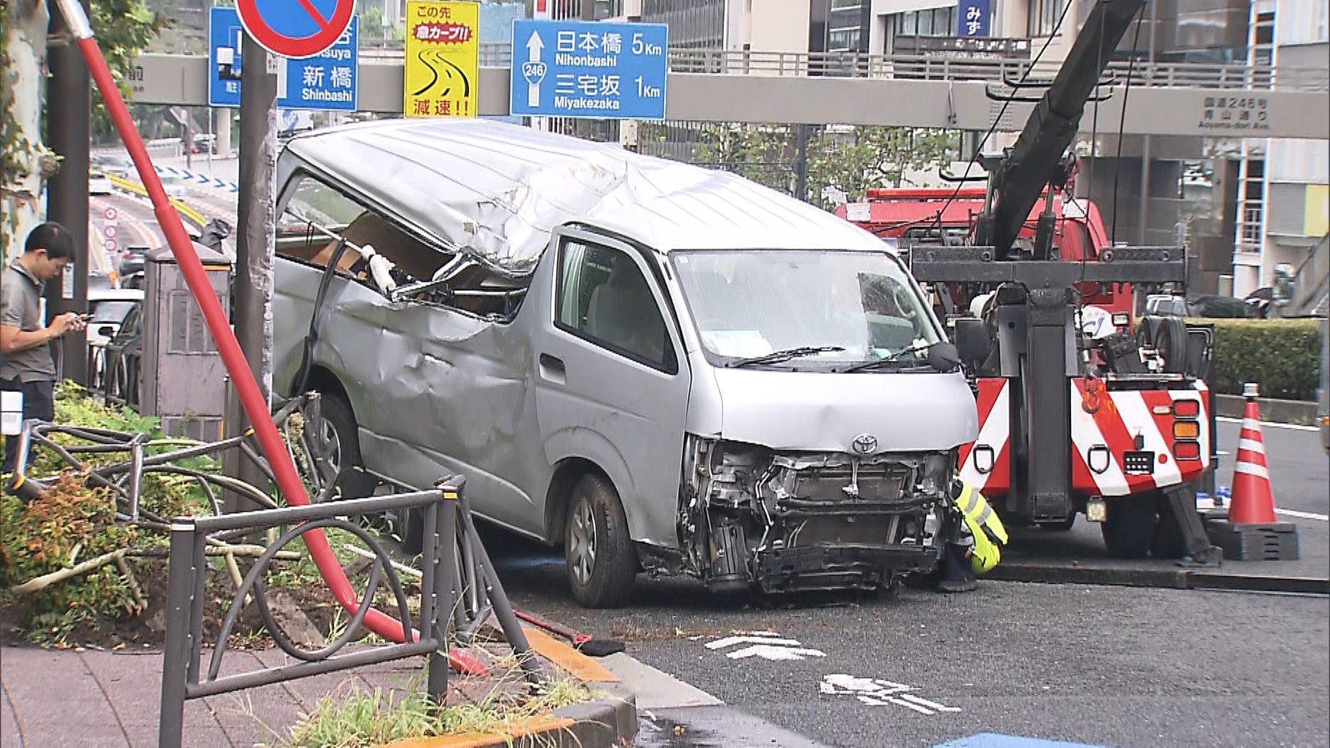 東京・赤坂でワンボックスカーがスリップし、電柱や車に衝突しました。