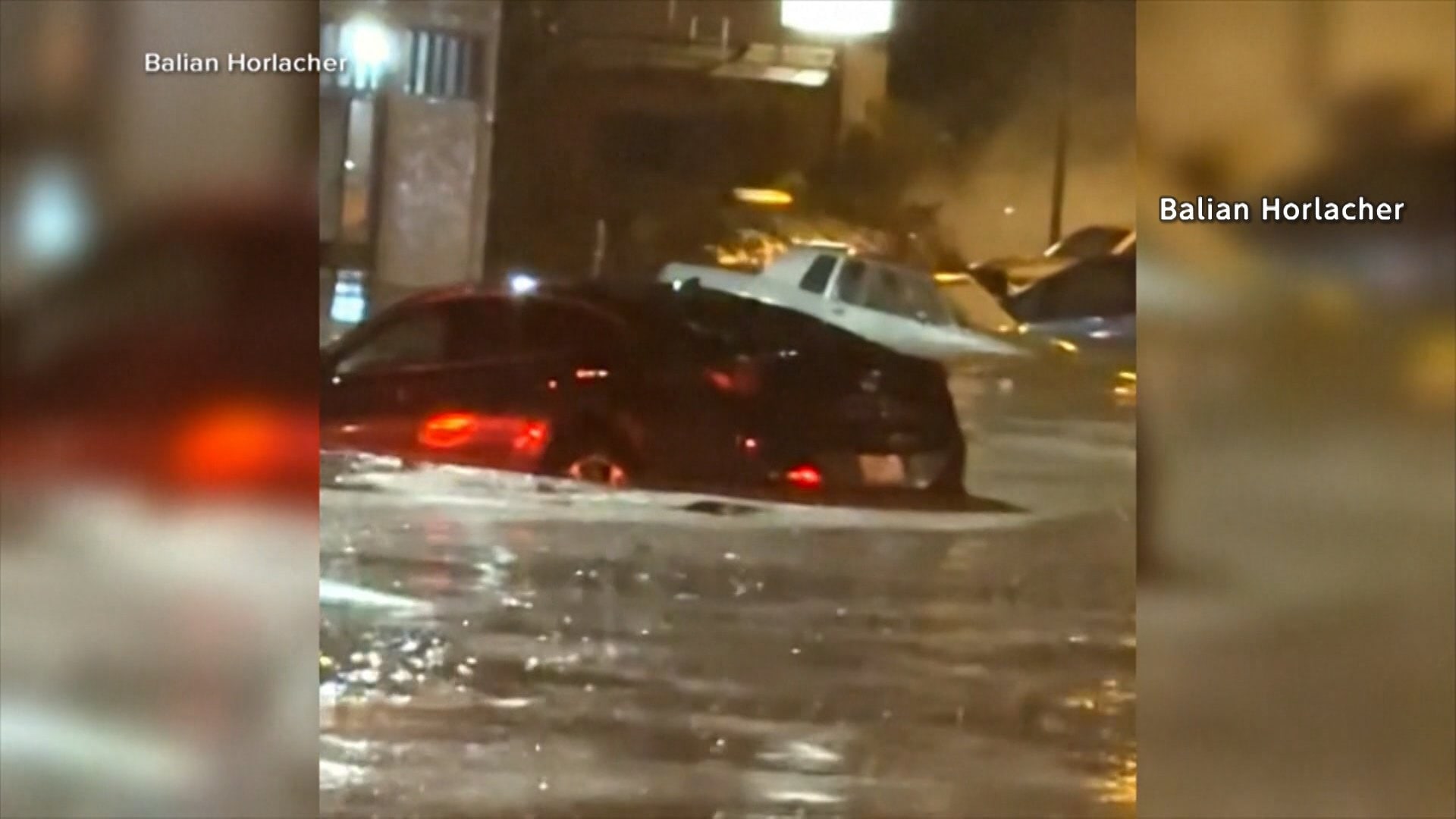 濁流が押し寄せ、何台もの車がゆっくりと流されていきます。