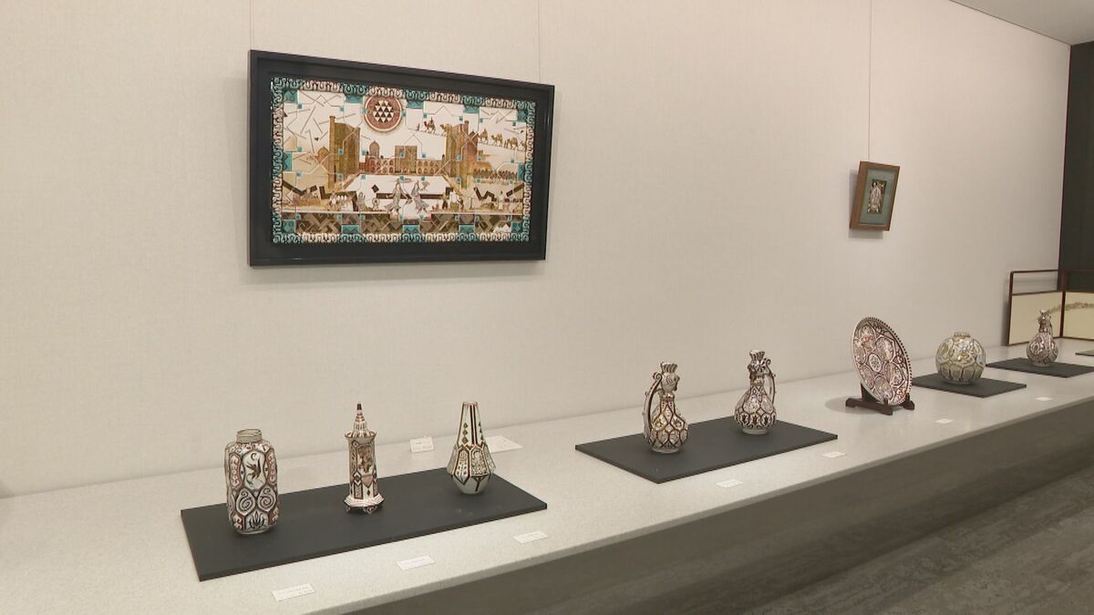 ジェイアール名古屋タカシマヤで開催されている展覧会「わが心のふるさとシルクロード 七代 加藤幸兵衛展」。岐阜県多治見市在住で、「ラスター彩」に造詣が深い陶芸家 七代 加藤幸兵衛さんによる壺や皿など90点が展示され、現在のイランにあたるペルシャの「ラスター彩」だけでなく、シルクロードの国々のさまざまな陶芸の技法が披露されています。
