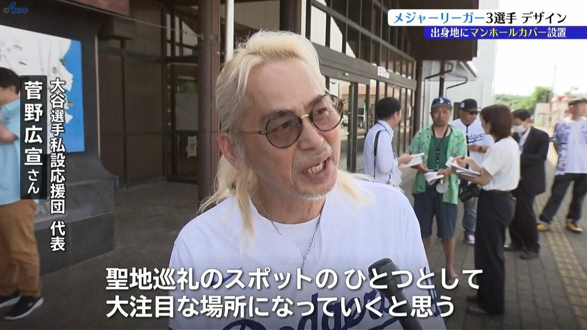 16日午前9時、奥州市のJR水沢江刺駅前で行われたお披露目式で、奥州市の倉成淳市長らが覆っていた幕を取り外すと、ドジャースの大谷翔平選手がデザインされたマンホールのふた(=マンホールカバー)が姿を現しました。