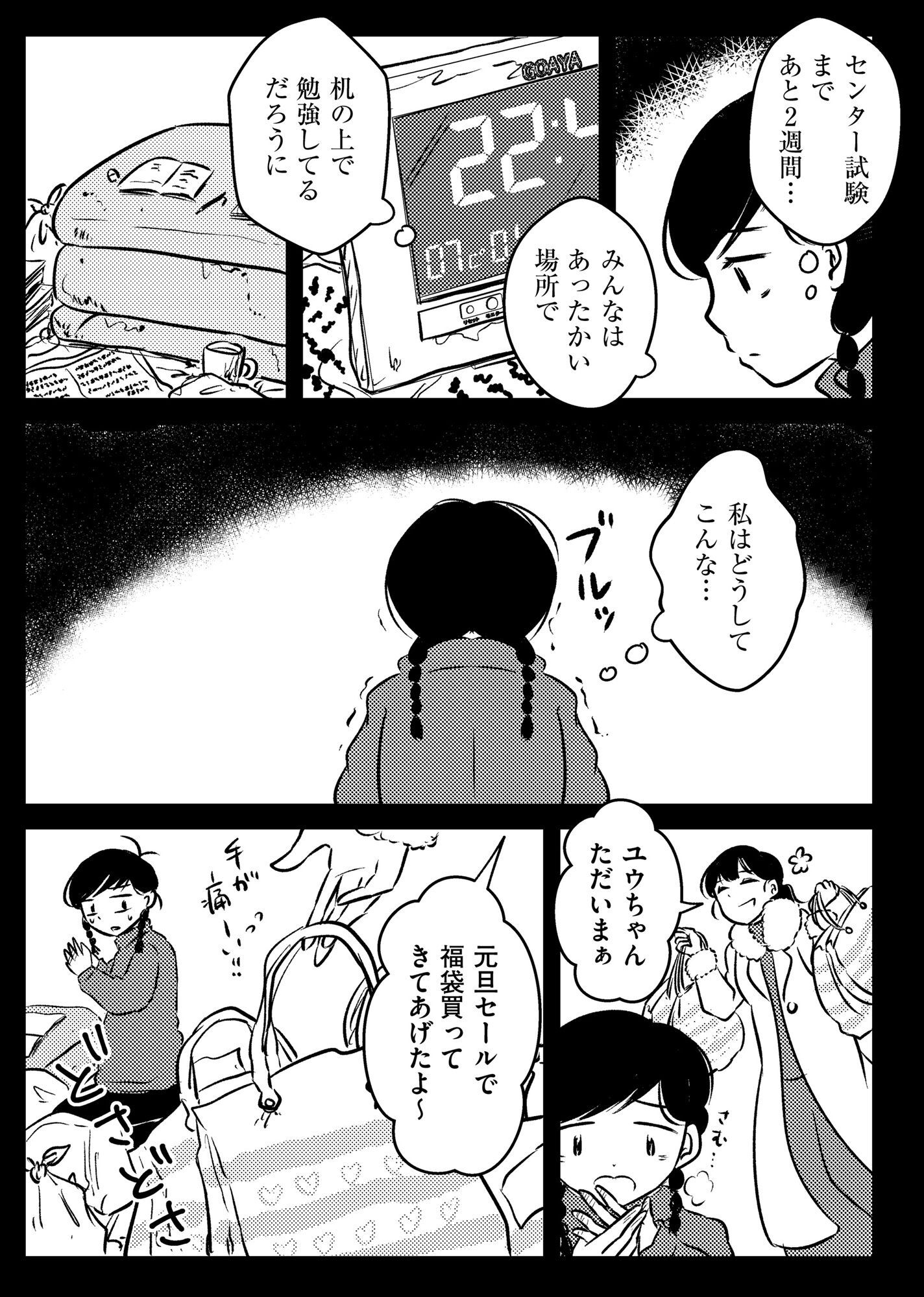 「東大入って自分だけ幸せになろうだなんて、ママ許さないからね!」。極寒の部屋で布団を机代わりに勉強した受験期。やがて「パパは来なく」なった家で、少女は自分の人生と向き合い始める。