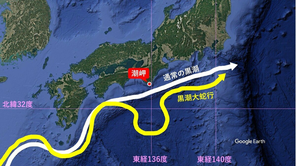 その「黒潮」は時折、紀伊半島〜東海沖で日本列島から大きく離れて流れることがあり、これが「黒潮大蛇行」と呼ばれています。