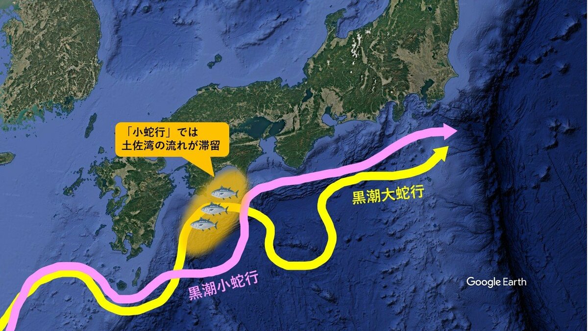 また、規模が大きめの黒潮小蛇行は、春先の3月〜5月に発生することが多く、この時期は土佐湾へ多くのカツオが来遊する「初ガツオ」の季節であるため、小蛇行の発生とカツオ来遊のタイミングがうまく噛み合うと、小蛇行が解消するまで土佐湾周辺でカツオが豊漁となることがあります。