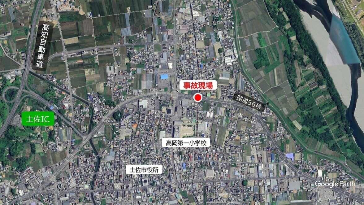 現場は片側2車線の国道56号「土佐市バイパス」の、信号機や横断歩道がある交差点です。警察によりますと、軽乗用車は南から東(高知市方面)へ向かって右折していて、横断歩道を歩いて渡っていた女性と衝突したということです。