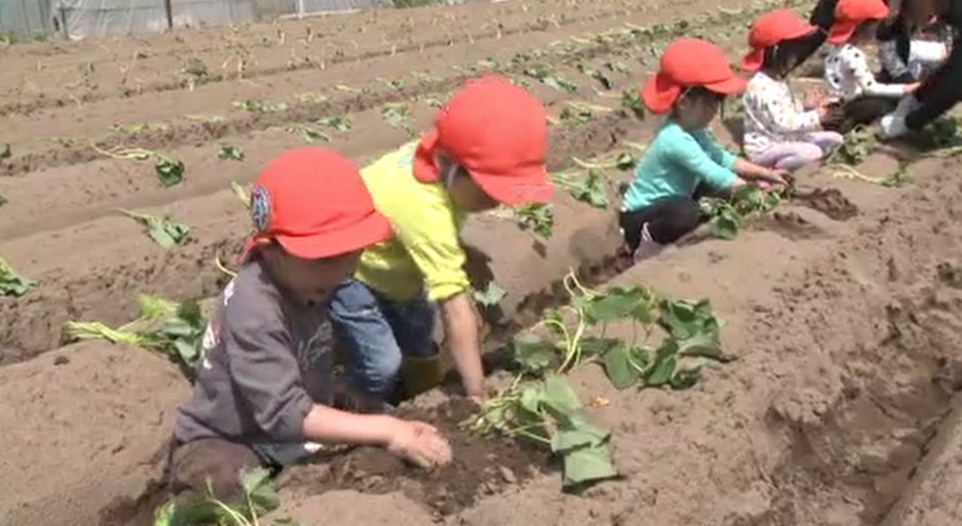 金沢市のこども園の園児たちが、地元に伝わる伝統野菜「五郎島金時」の苗植えに4日、挑戦しました。