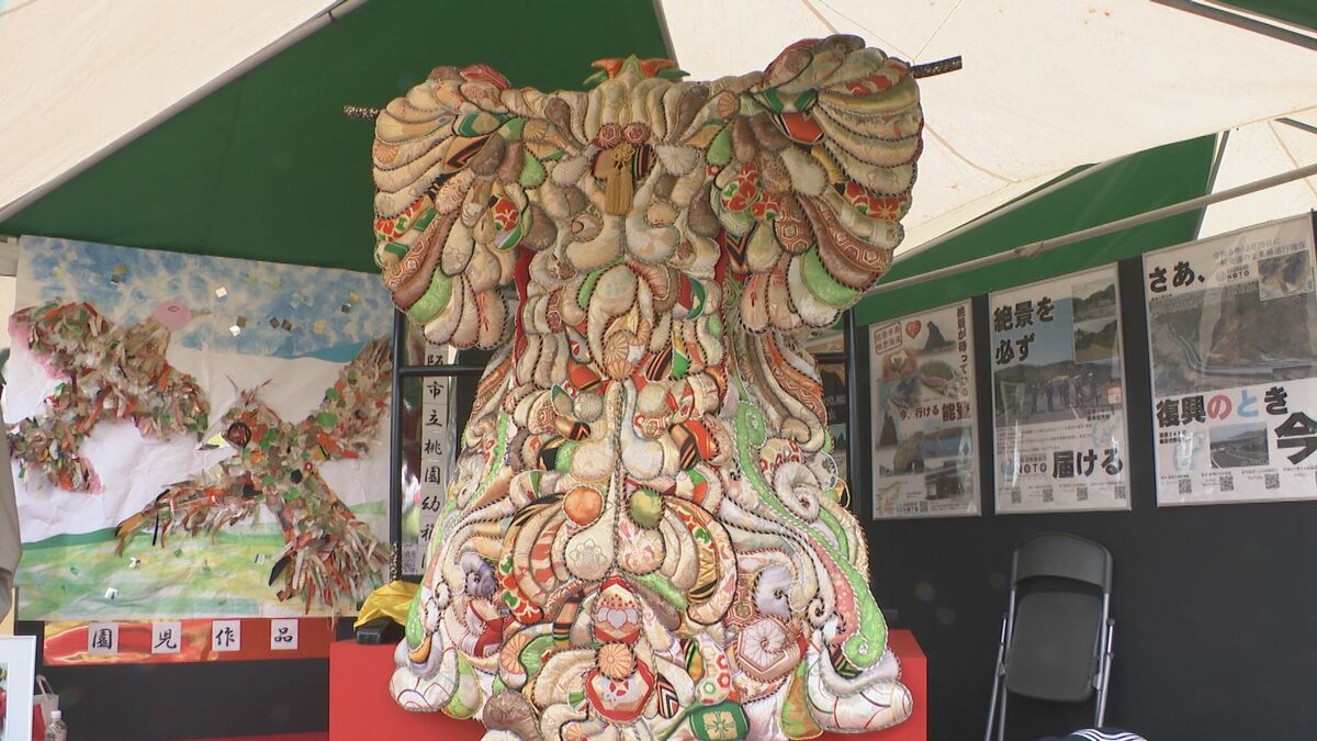 中でも、地震や豪雨で被災した家屋で保管できなくなった着物の帯50本を集めて制作されたオブジェのコーナーでは、鳳凰の翼と龍の蛇腹をイメージした高さ3メートルの着物オブジェに訪れた人たちが興味深く見入っていました。