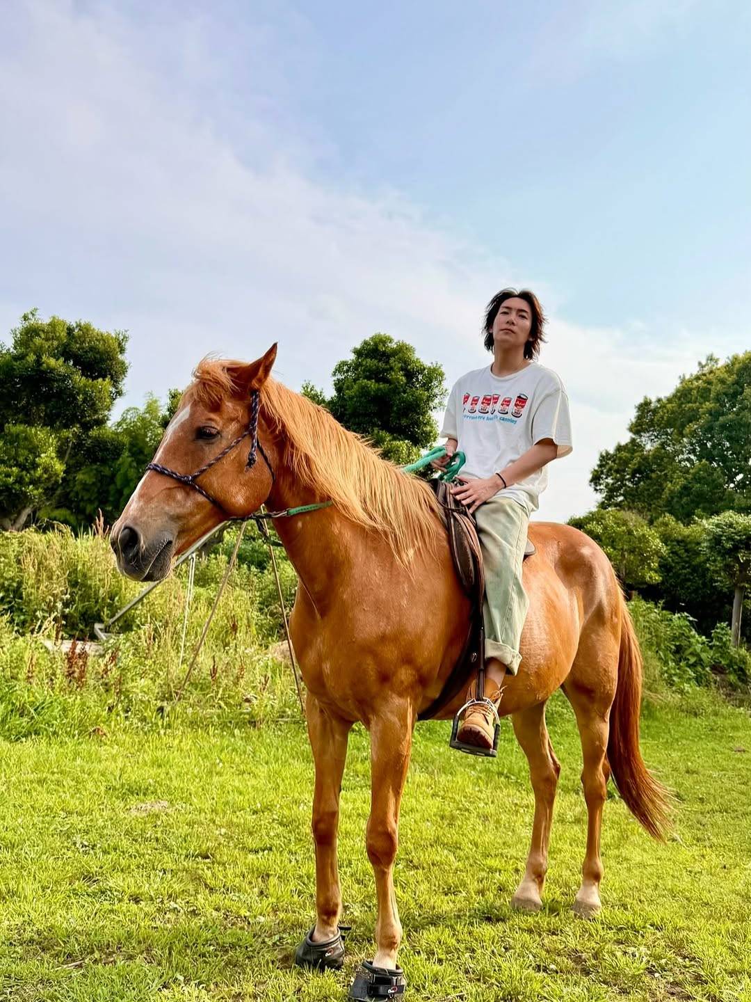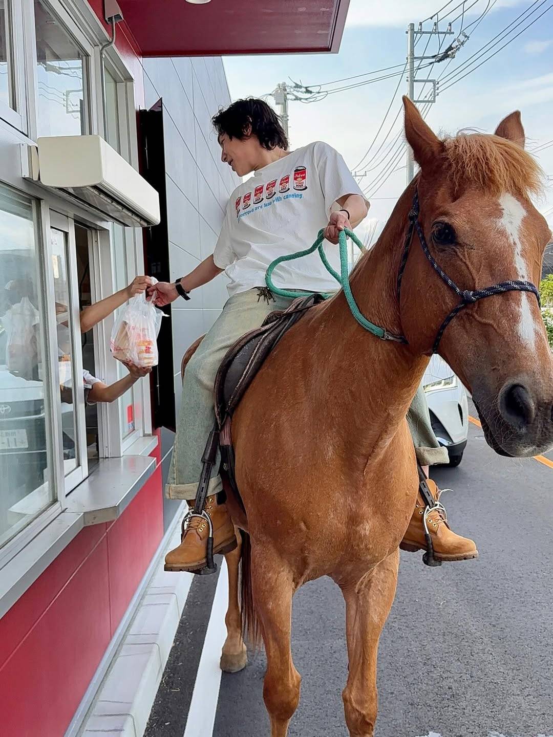 「しっかり道交守ってます」のタグを付けて「馬でドライブスルー!快く協力してくれた店員さんありがとうございました。俺の人生には同じ毎日なんて存在せえへん。常に子ども心を持って新しいオモロいことを探し続ける。動画お楽しみに」と、馬に乗ってドライブスルーを利用する様子を投稿している。また、前日には馬に乗って散歩する様子をXに投稿している。