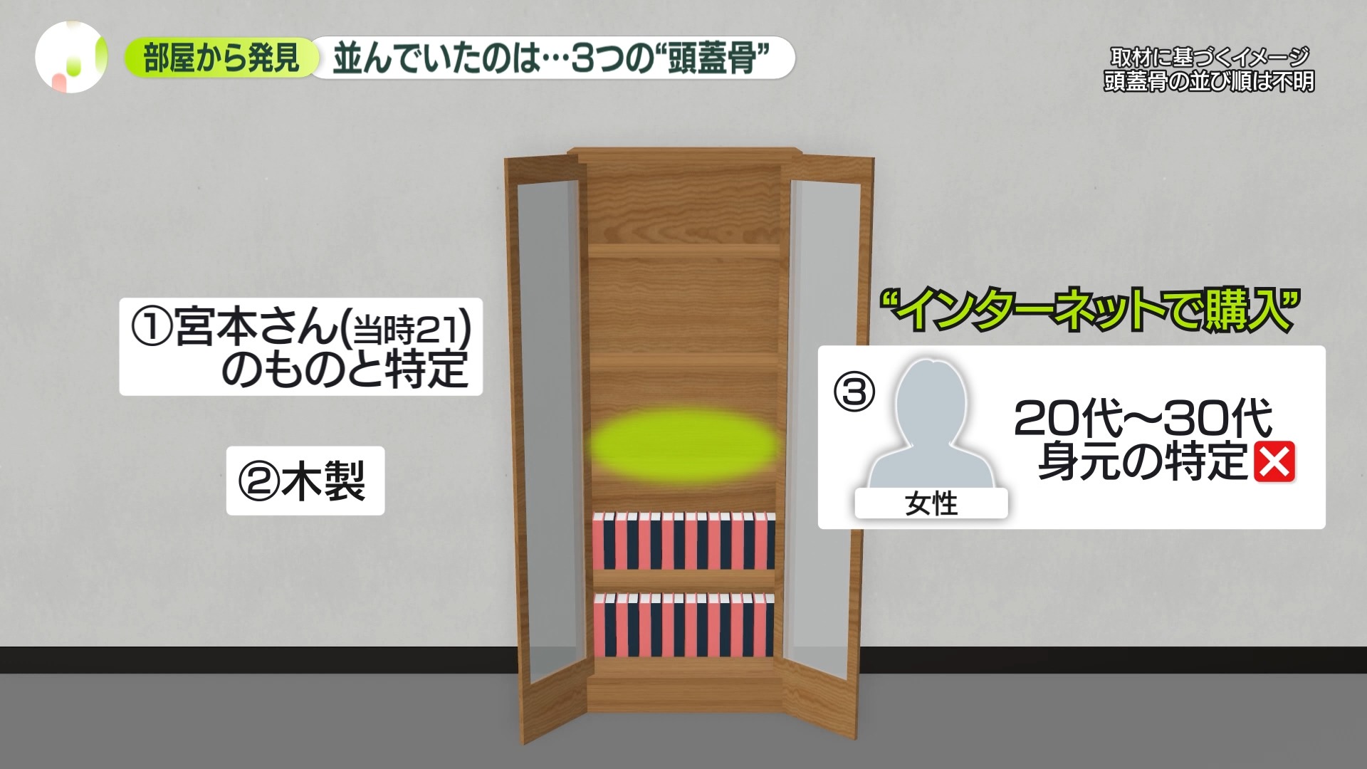 頭蓋骨が見つかったのは、斎藤容疑者が使っていたという部屋です。本なども置いてあった棚の中央に頭蓋骨のようなものが3つ、並べて置いてあったということです。