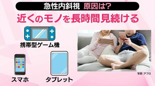 「そうなんです。大人にもリスクはあるんですが、急性内斜視は長時間ずっと近くのモノを見続けていることが原因の1つとされています。やはり携帯型のゲーム機・スマホ・タブレットの画面をじっと見続けていることで、突然引き起こされることがあります」