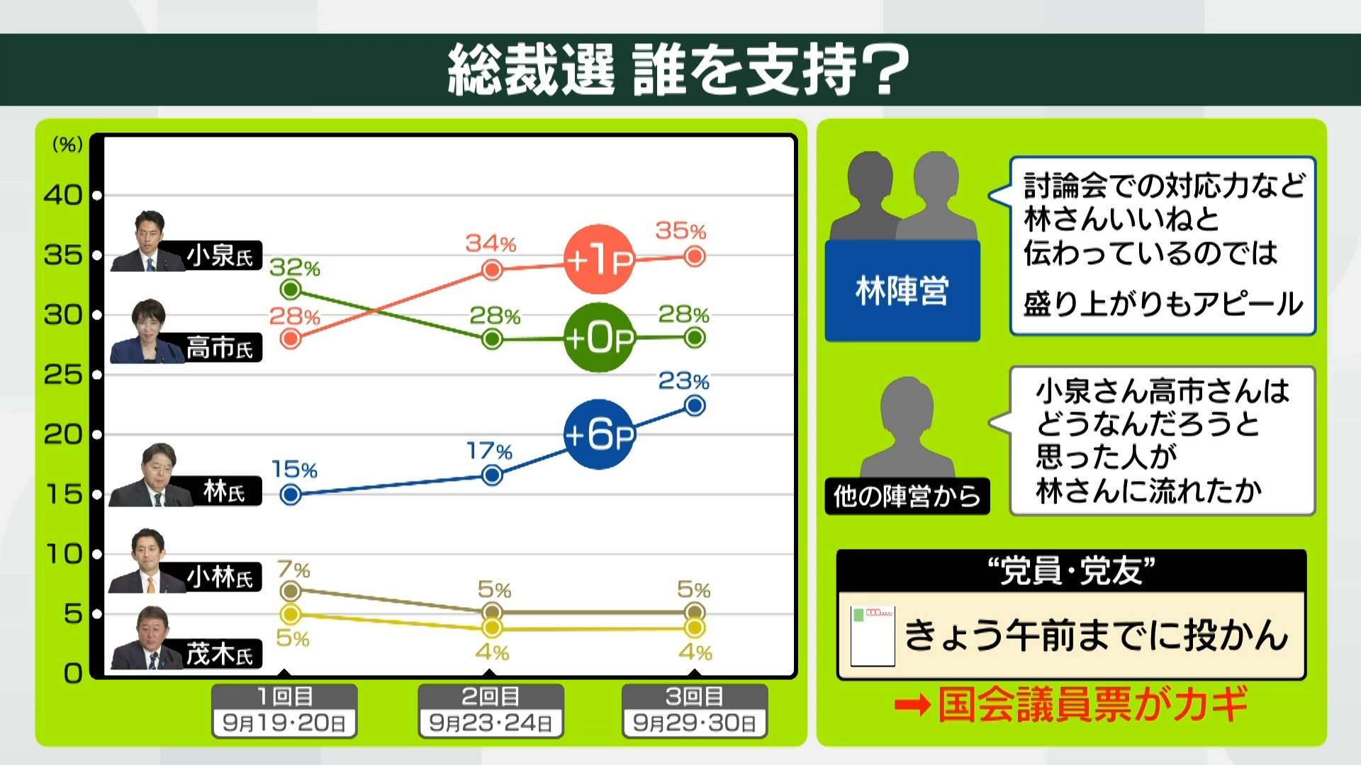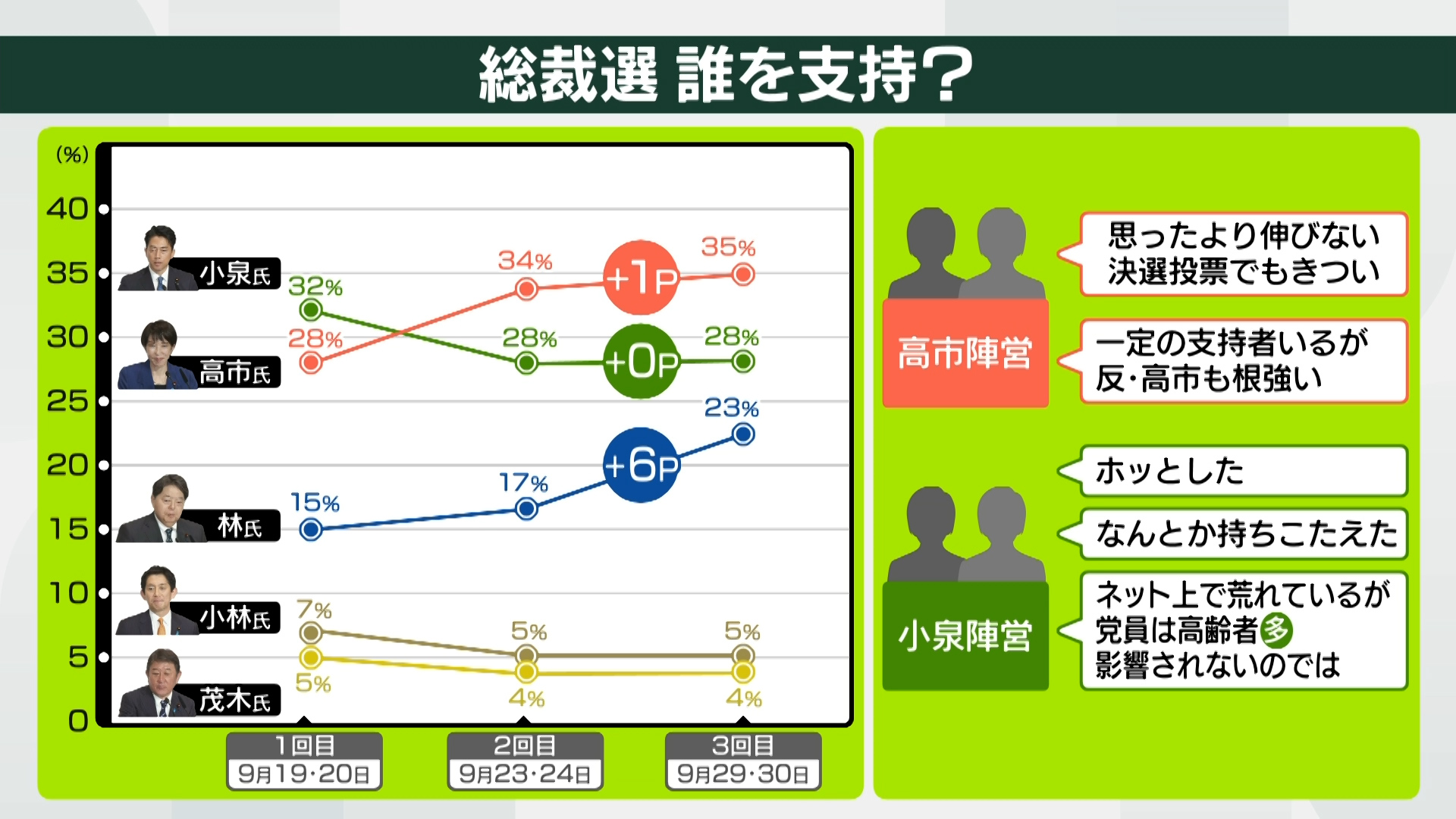 ■差を縮めた林氏 小泉陣営、高市陣営の反応は?