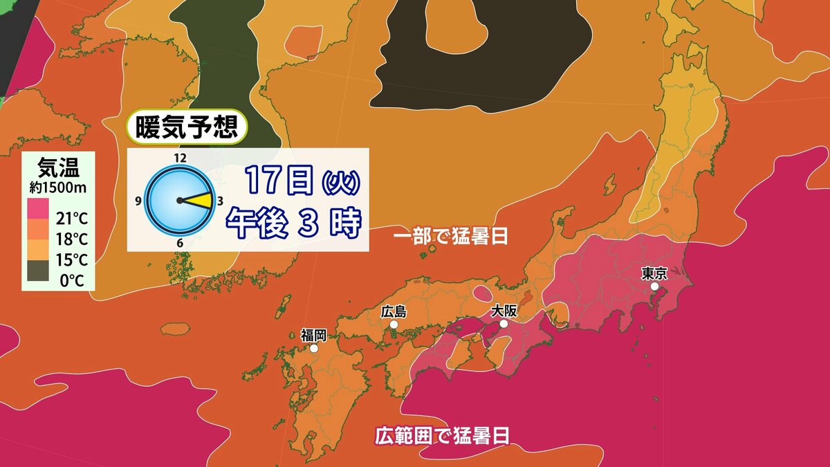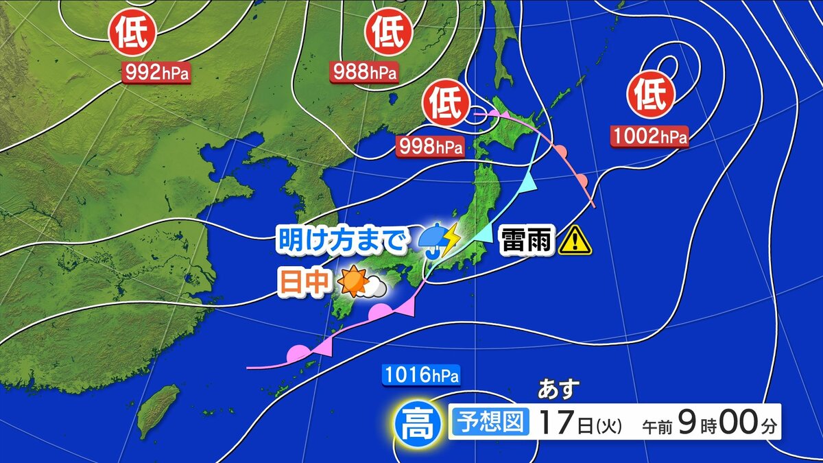 17日(火)明け方まで急な強雨・落雷・突風に注意 日中は安定した青空 35℃に迫る地点も