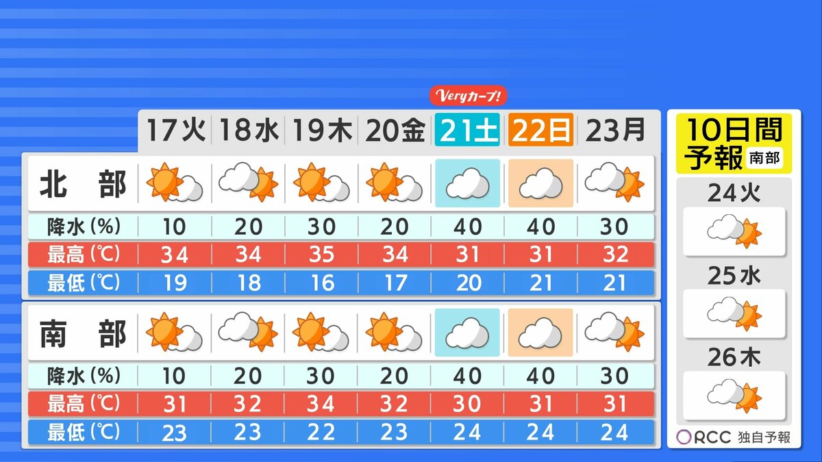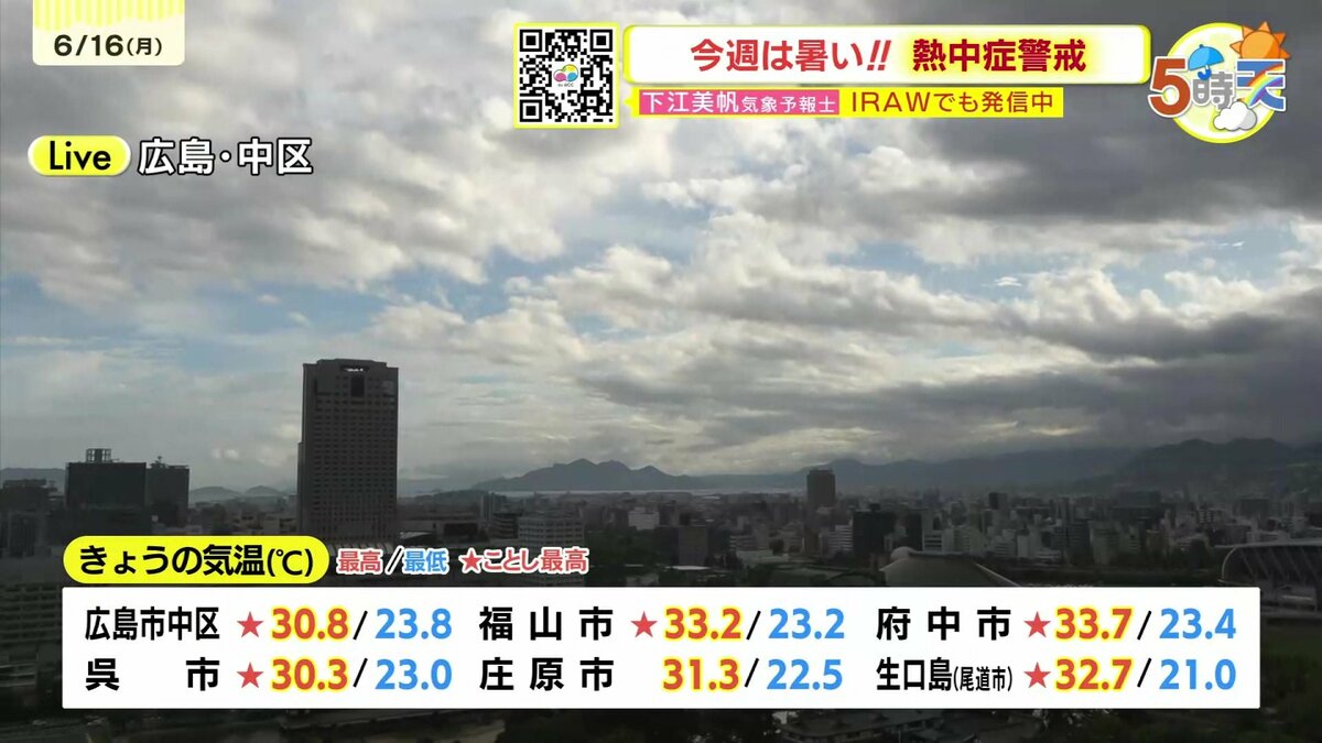 きょう16日(月)の広島県内は、変わりやすい空模様が続き、昼間は晴れ間が出たり急に雨が降ったりと不安定な天気でした。日中の気温は30℃を超えたところが多く、広島市中区の最高気温は30.8℃ 府中市33.7℃など真夏日となり、各地ことし1番の暑さを更新しています。