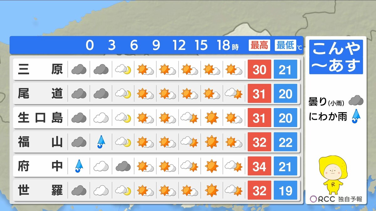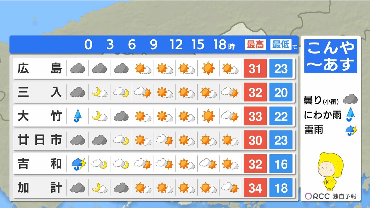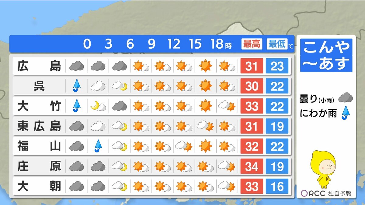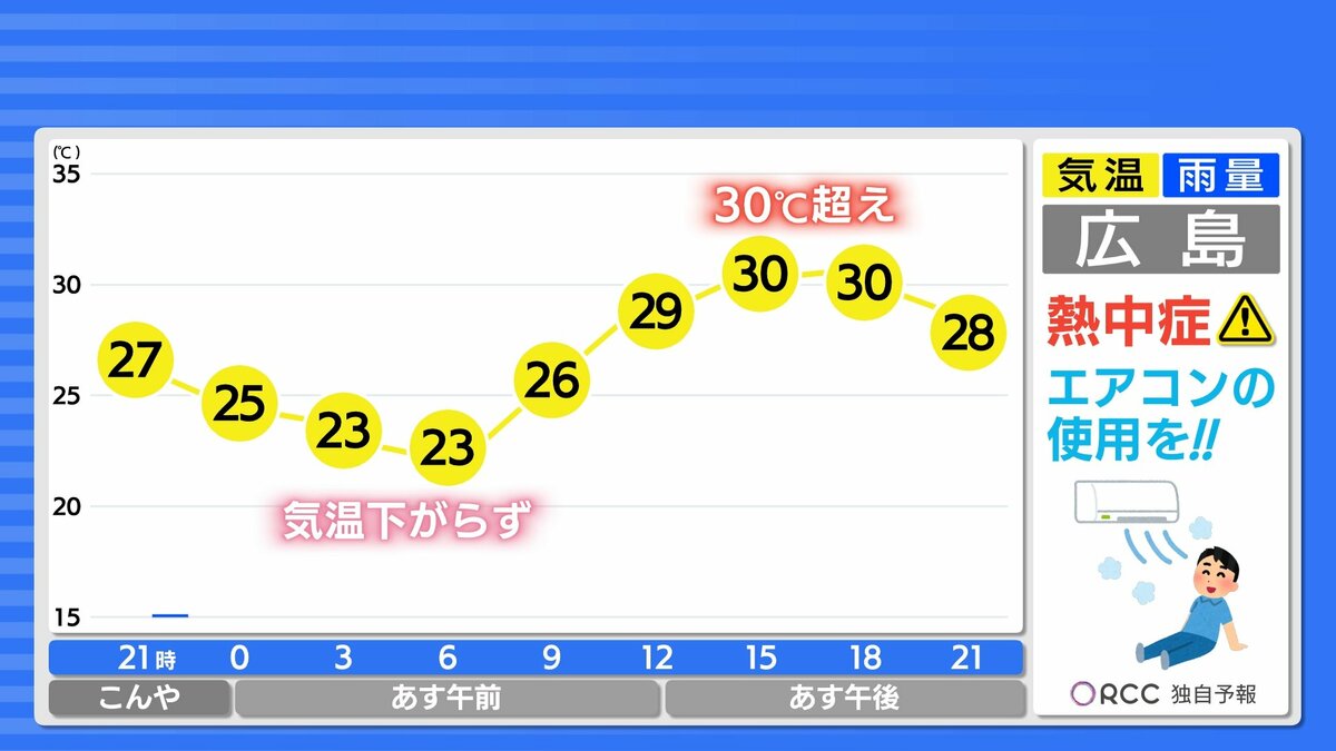 夜間もあまり気温が下がらず、寝苦しい夜が続きます。湿度が高くムシムシと感じられそうです。はやめにエアコンを使用するなどして、夜間の熱中症にもご注意ください。予想最高気温は、加計・府中市・三次・庄原で34℃ 広島市中区で31℃ 福山32℃などです。暑さ対策をしっかりして、熱中症に警戒してください。