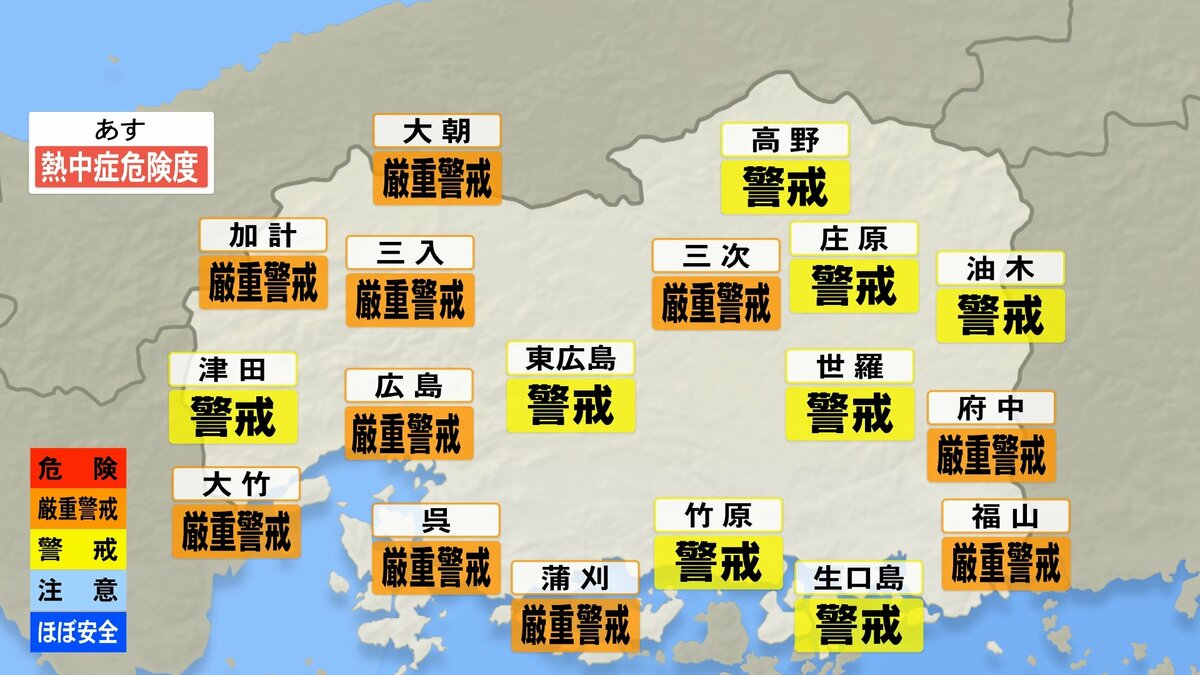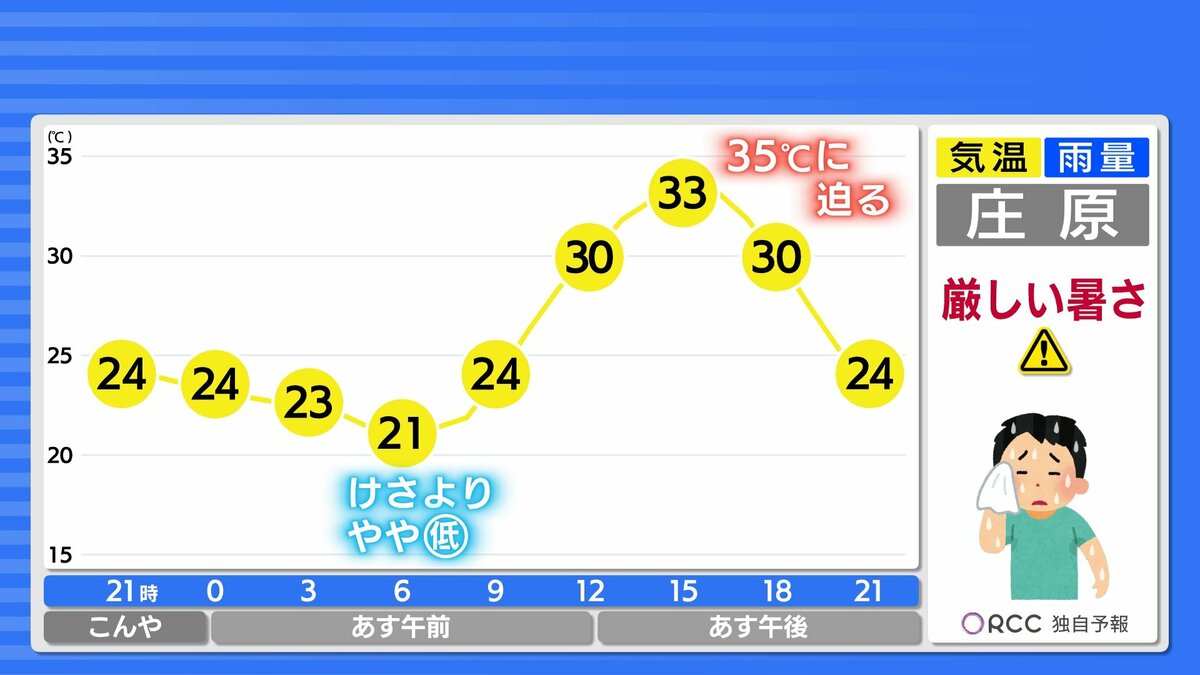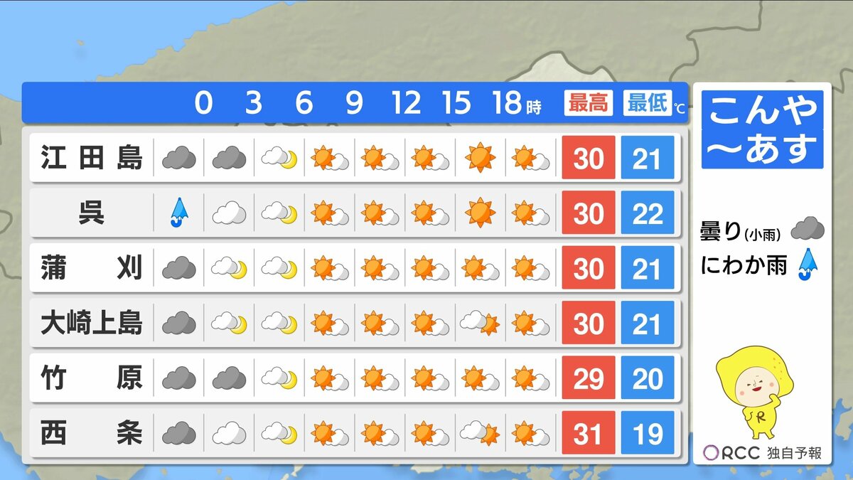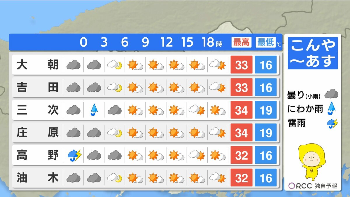 夜間もあまり気温が下がらず、寝苦しい夜が続きます。湿度が高くムシムシと感じられそうです。はやめにエアコンを使用するなどして、夜間の熱中症にもご注意ください。予想最高気温は、加計・府中市・三次・庄原で34℃ 広島市中区で31℃ 福山32℃などです。暑さ対策をしっかりして、熱中症に警戒してください。