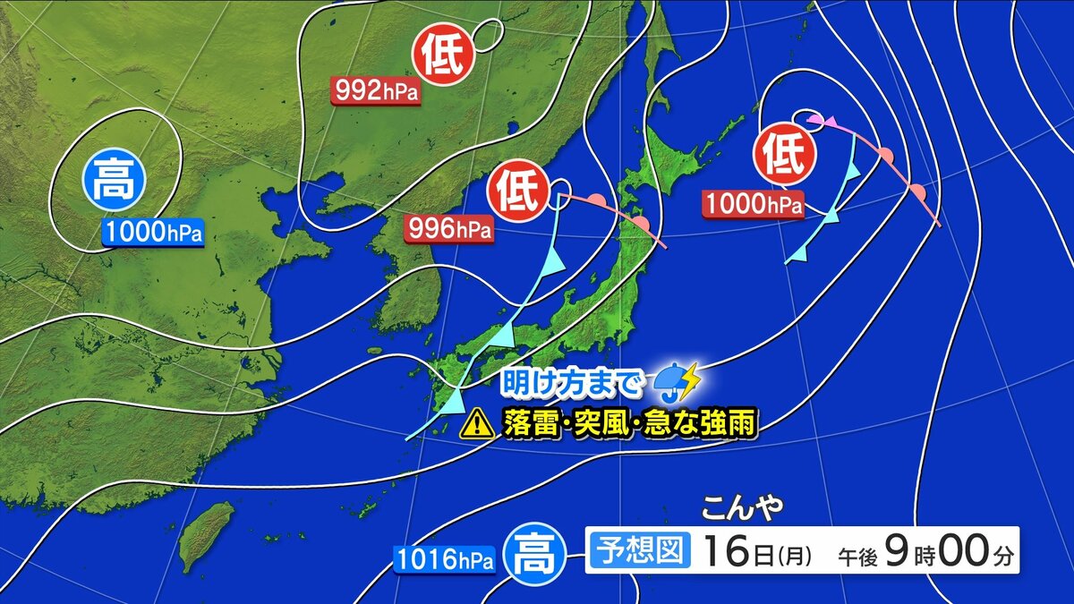 このあと低気圧からのびる寒冷前線が西日本付近を通過するため、大気の状態が非常に不安定になります。あす明け方までを中心に落雷・突風・急な強雨にご注意ください。日中は安定した青空が広がるでしょう。