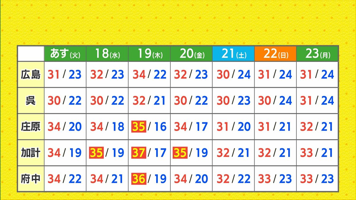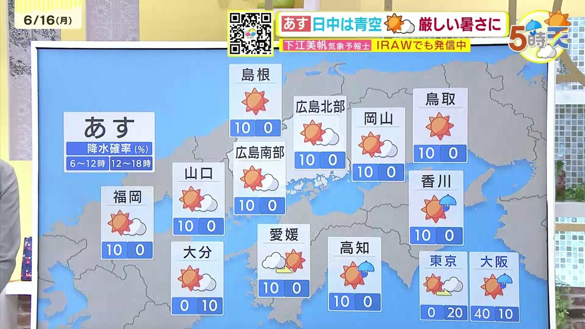 【あす6/17(火)広島天気 】明け方まで急な強雨・落雷・突風に注意 日中は安定した青空 35℃に迫る地点も