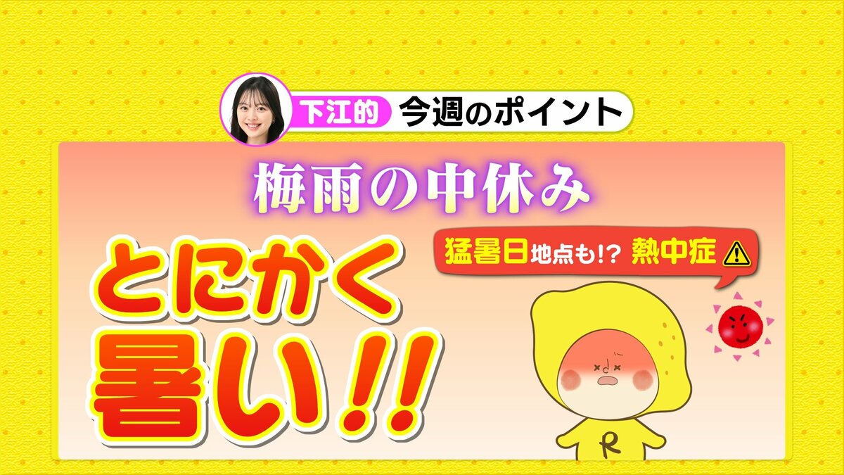 今週は晴れ間が出る日が多く、梅雨の中休みとなりそうです。日中の気温がかなり高くなり、この時期としては異例の厳しい暑さが続くでしょう。最高気温は、北部や内陸部を中心に35℃以上の猛暑日地点も出る可能性があります。熱中症の危険度が高くなるので、こまめな水分補給やエアコンの適切な使用など、熱中症対策を万全にお願いします。
