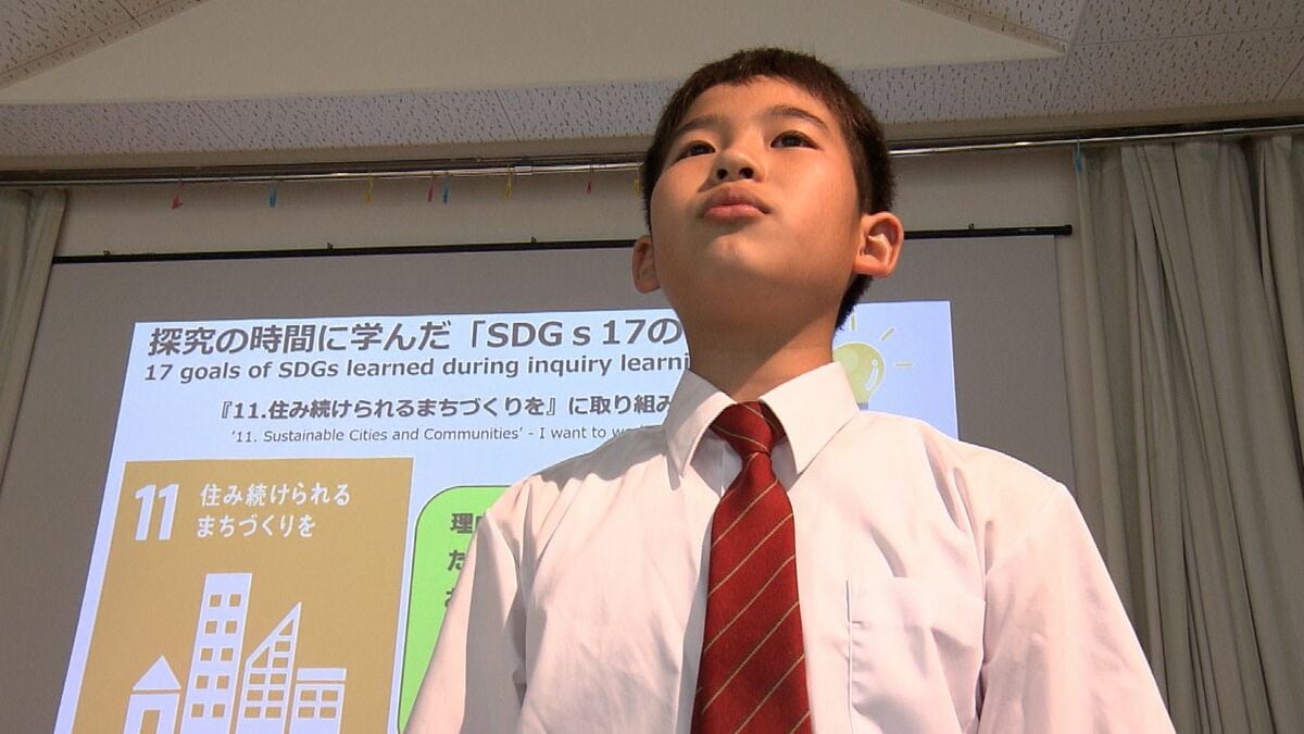 6年生の山田啓一朗くんが発表するのは、SDGs=持続可能な開発目標の1つ、「住み続けられるまちづくり」のために取り組んでいることです。