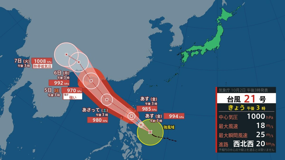 台風はきょう(2日)正午現在、1時間におよそ20キロの速さで西北西へ進んでいて中心の気圧は1000ヘクトパスカル、中心付近の最大風速は18メートル、