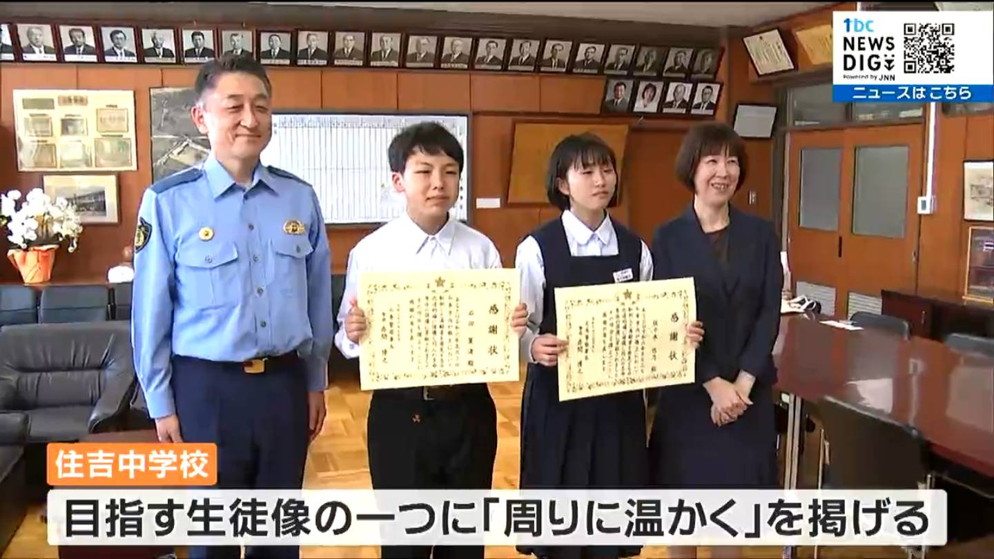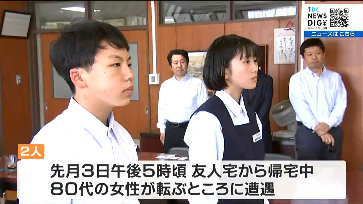 5月、宮城県石巻市内の路上で転んだお年寄りを助けた中学生2人に、警察から感謝状が贈られました。2人は女性を介抱するとともに近くの交番に送り届けました。