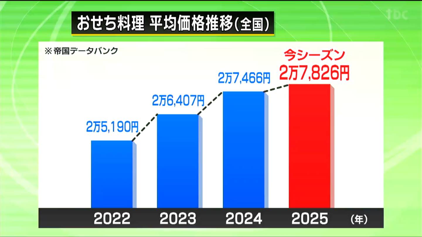 また、全国の百貨店やスーパーが取り扱う「おせち」の価格も、帝国データバンクによりますと、7割ほどの企業が価格を去年と据え置きか下げていて、値上がりはここ数年では、緩やかということです。