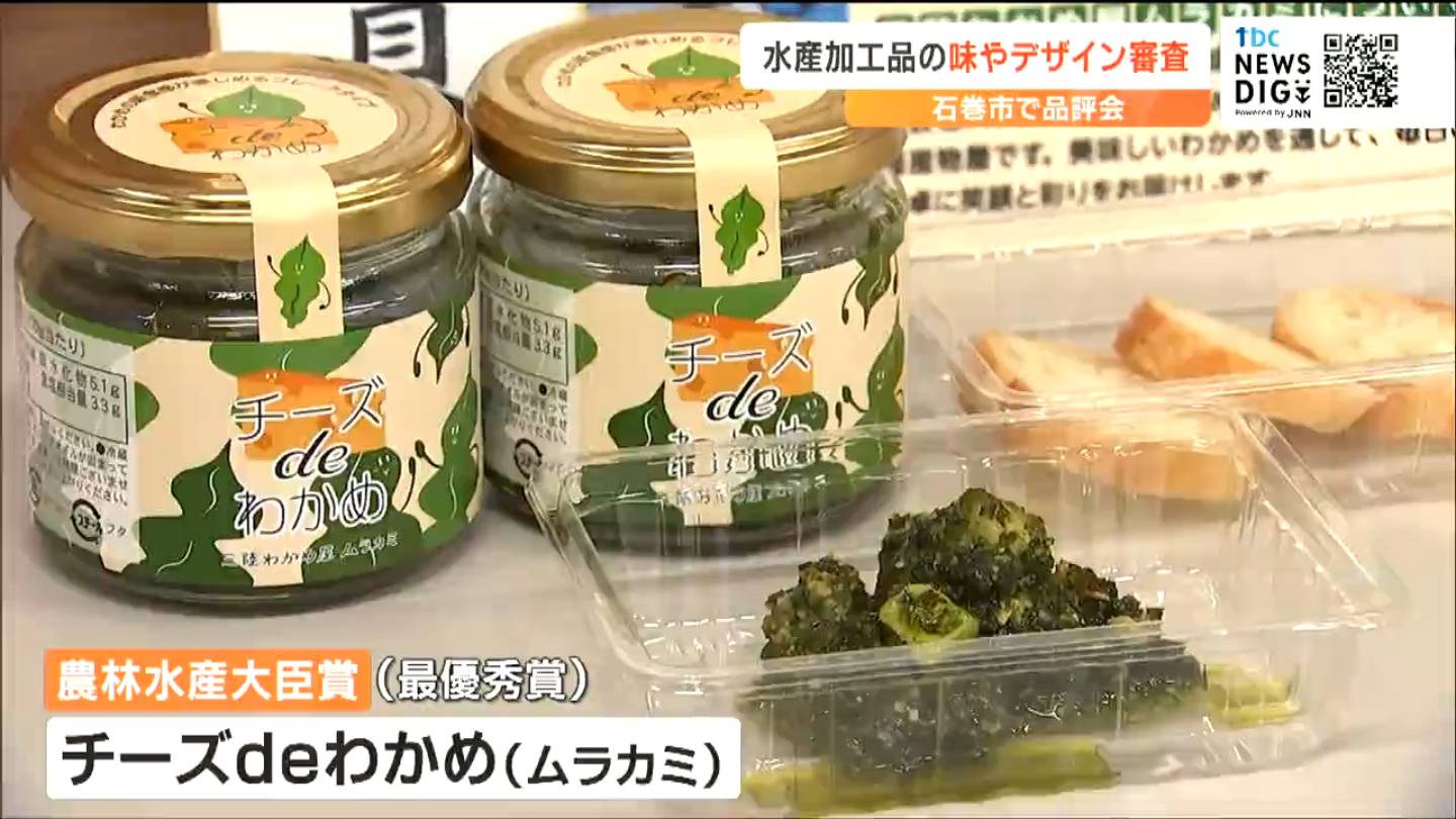 宮城県内で作られた水産加工品の味やデザインなどを競う品評会が、石巻市で21日開かれました。最優秀賞には、気仙沼市から出品されたワカメのオリーブオイル漬けが選ばれました。