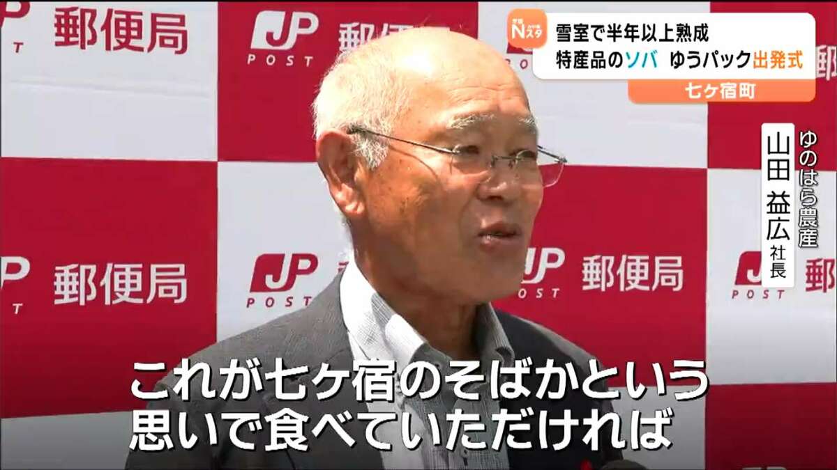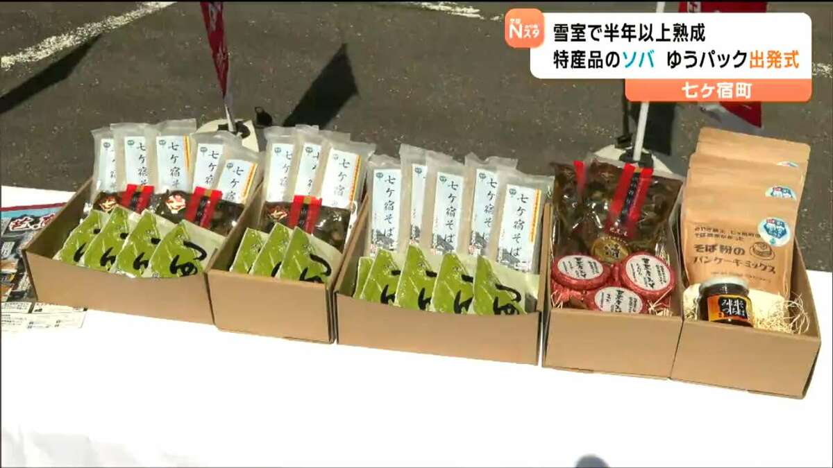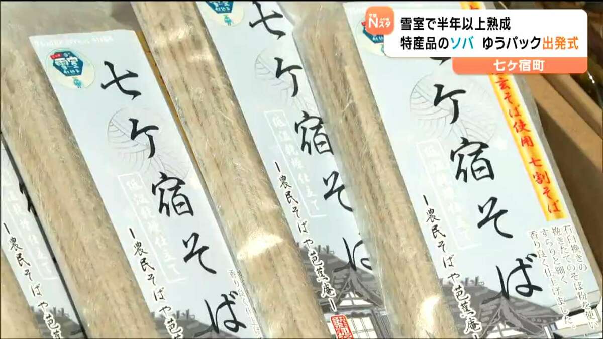 “雪室”熟成で甘みと風味増し増し「七ヶ宿そば」ゆうパック出発式 宮城・七ヶ宿町