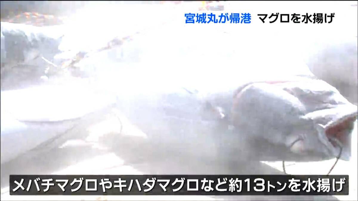 宮城県の実習船「宮城丸」で航海実習を行ってきた水産高校の生徒たちが、20日朝石巻漁港に戻り、実習で獲ったマグロを水揚げしました。
