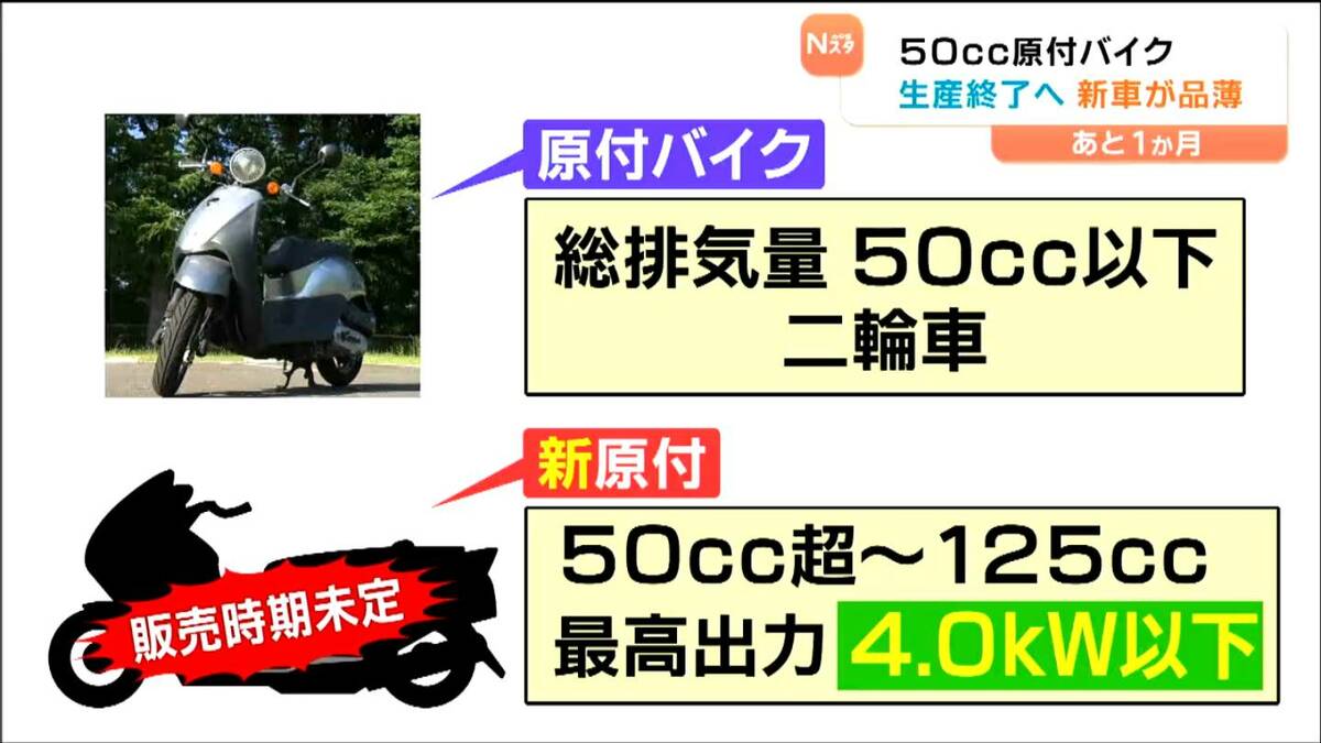 生産終了の理由は「排ガス規制」の強化。11月から50cc以下の原付バイクにも規制が適用されます。技術的にクリアするのが難しくメーカー各社は順次、新車の生産を終了する見通しです。生活の足として長年愛されてきた原付バイク。急いで選びに来た客もみられました。