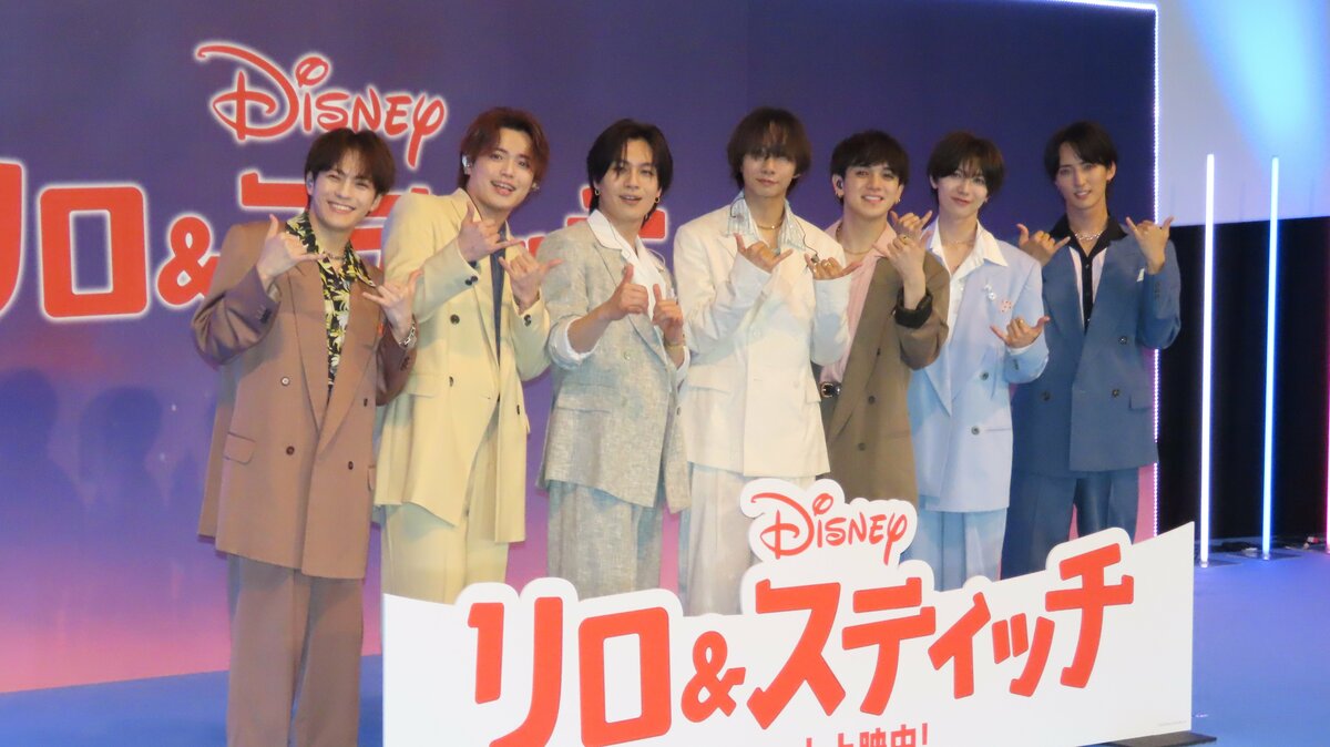7人組グループ『Travis Japan』(中村海人、宮近海斗、七五三掛龍也、川島如恵留、吉澤閑也、松田元太、松倉海斗)が、全員揃って映画「リロ&スティッチ」のイベントに登壇しました。
