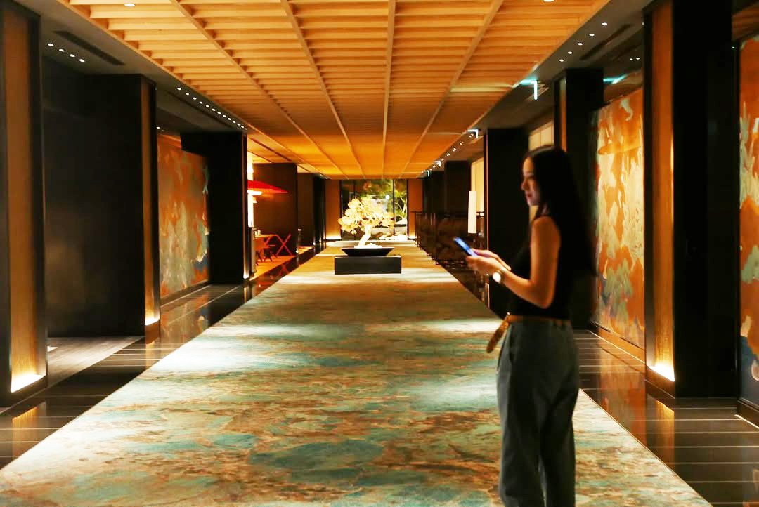 ホテルの様子も共有されており、壁画が特徴的な長い廊下や、ホテルの一室で鏡に映る自身の姿を撮影した写真もアップロードしています。白いシャツとデニムパンツ、茶色のベルトというシンプルながらも洗練されたファッションが印象的です。