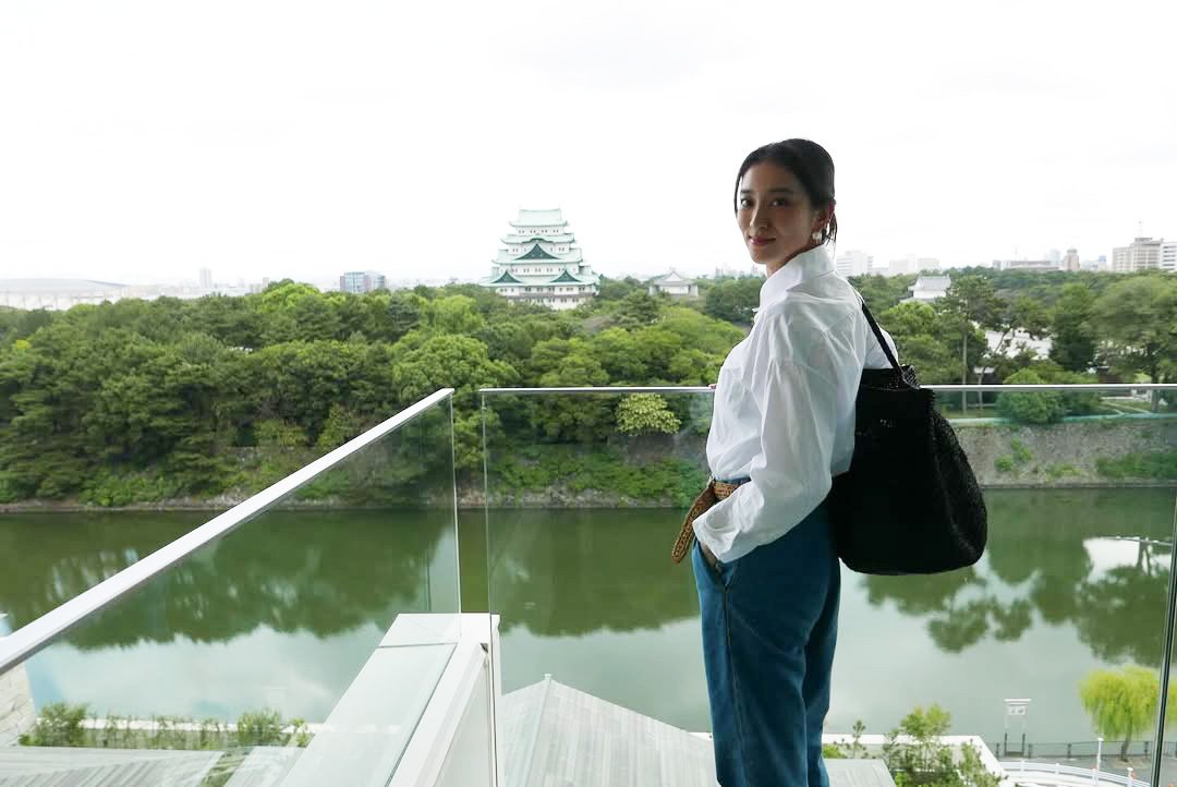 武井さんは、展望デッキでは、白いシャツに青いジーンズという爽やかなコーディネートで立ち、背景に名古屋城と堀、緑豊かな景色を収めた一枚を公開しました。透明なガラスと金属の手すりを備えたスペースからの眺めは、武井さんの言葉通り「圧巻」の一言に尽きる景観となっています。
