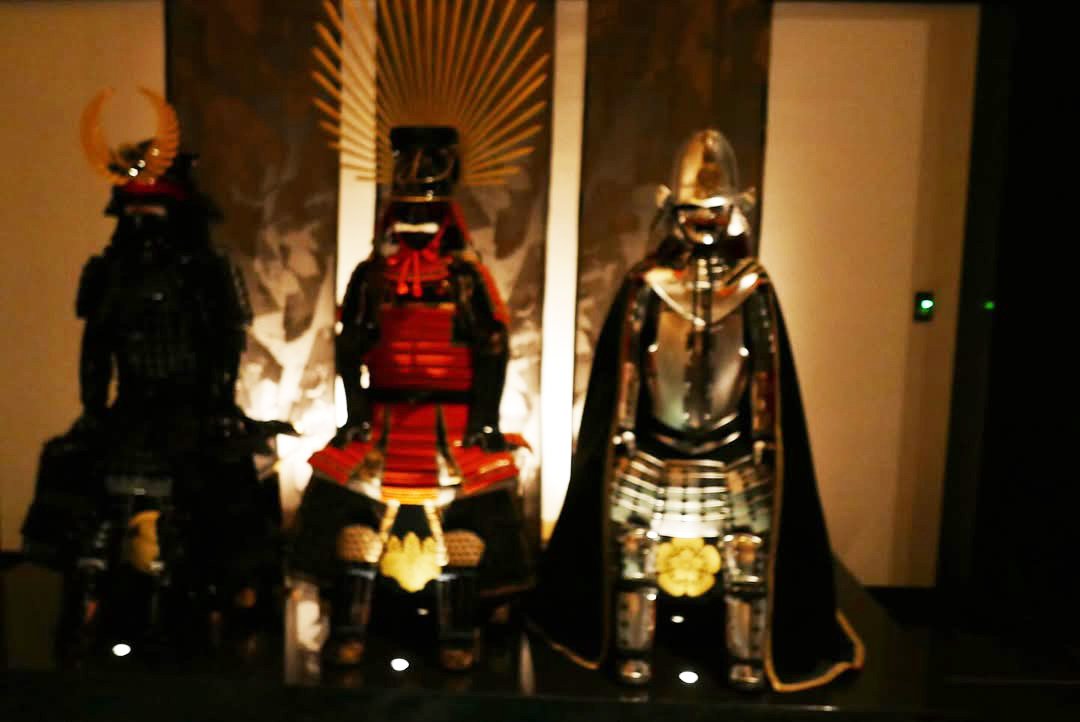 施設内の三体の甲冑が並ぶ展示室の写真も投稿しています。左の黒地に黄金の角兜を持つ甲冑、中央の赤と黒の鎧、右の銀色に金の装飾と黒いマントを身につけた甲冑が威厳ある姿で展示されていました。