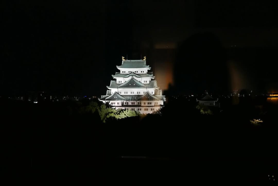 夜には名古屋城のライトアップも撮影。闇に浮かび上がる白い外観と緑の屋根を持つ天守閣の姿は、幻想的な雰囲気を醸し出しています。周囲の樹木と光に照らされた城の対比が美しく捉えられています。