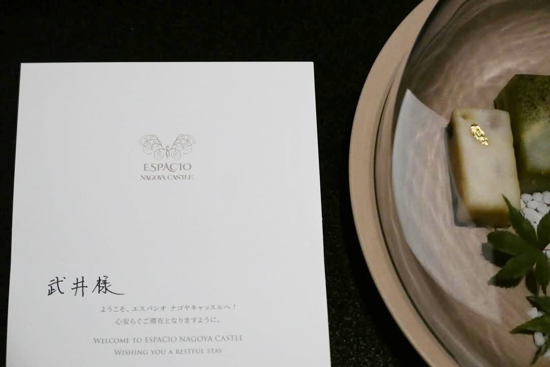 また、「武井様」と記された招待状とお菓子が用意されていたようです。招待状には上部に装飾的なロゴがあり、金粉が添えられたお菓子や緑の葉とともに洗練された演出がなされていました。