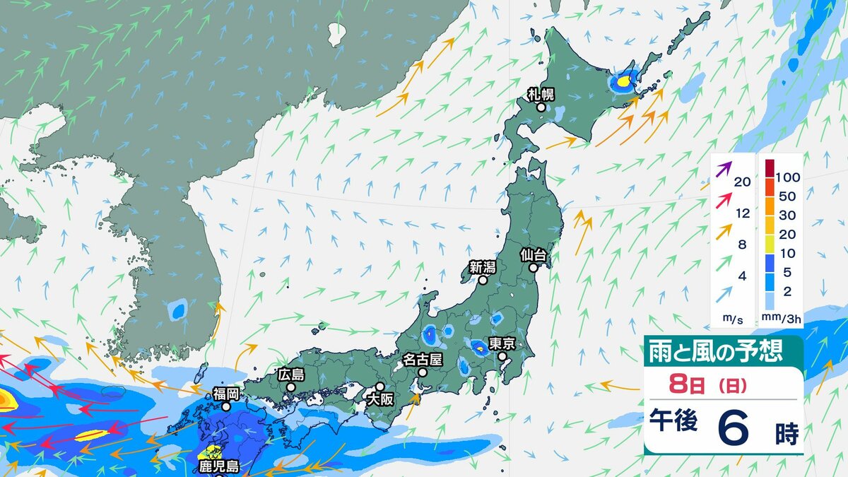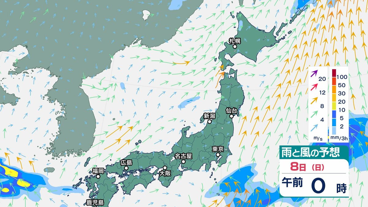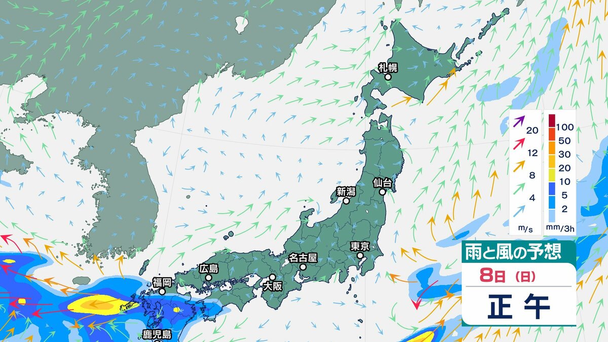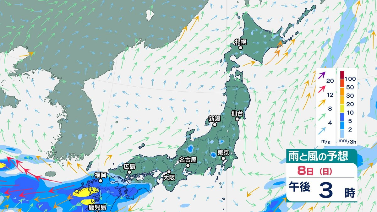 特に西日本では8日、前線に向かって暖かく湿った空気が流れ込むため、大気の状態が非常に不安定になると予想されています。雷を伴う激しい雨が降り、大雨となる所があるということです。