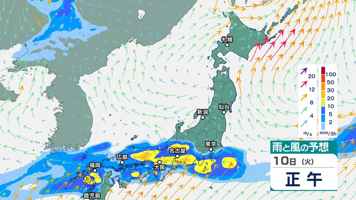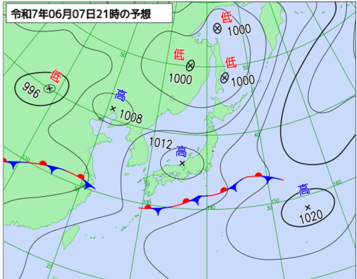 気象庁によりますと、現在オホーツク海上を北北東に進む低気圧があり、これに伴う前線が南西諸島の南から小笠原諸島近海、さらに日本のはるか東にのびています。