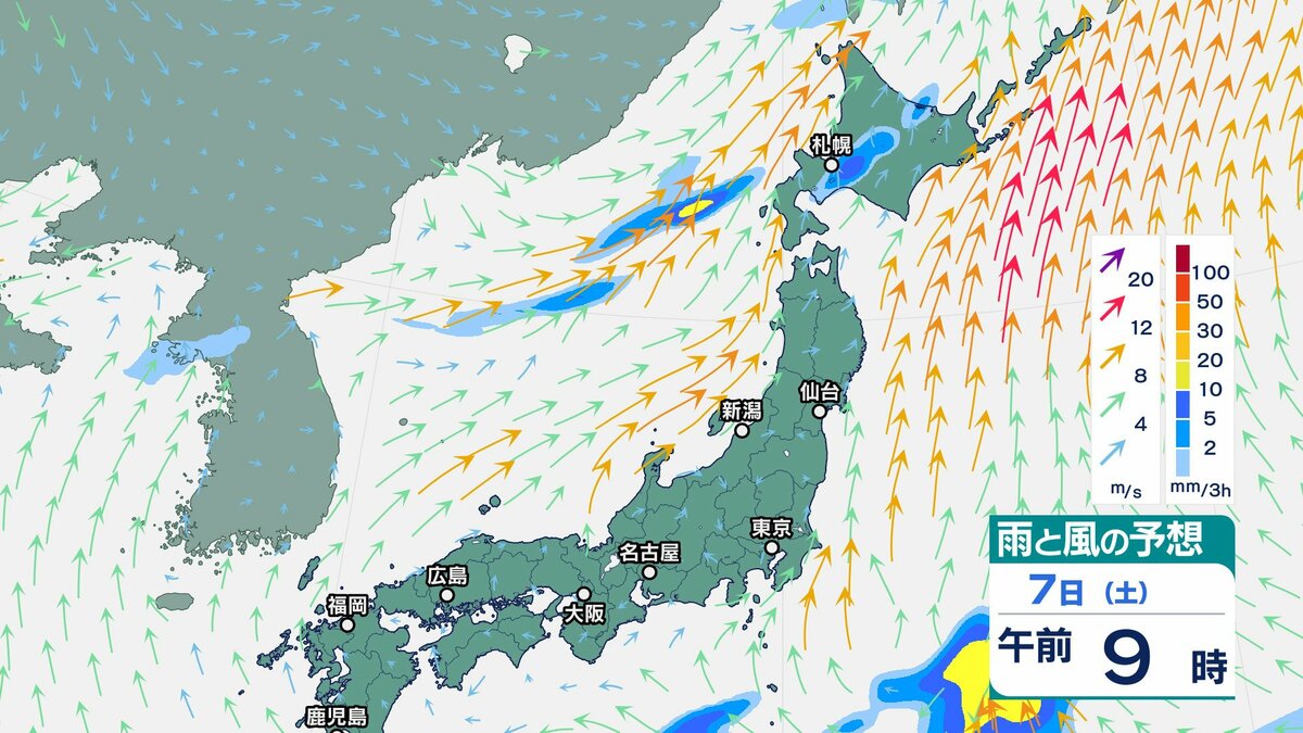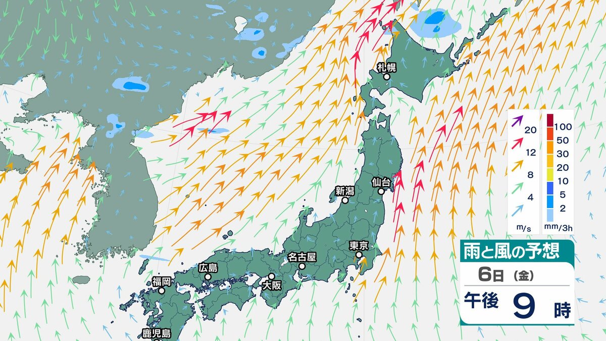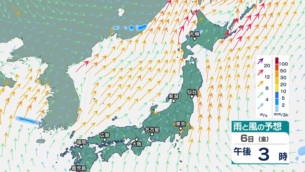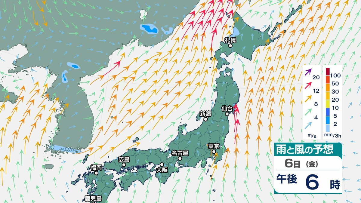 また、北日本では低気圧や前線と日本の南の高気圧との間で気圧の傾きが大きくなっています。このため、やや強い風や強い風が吹き、波が高くなっている所があります。