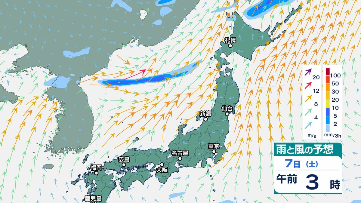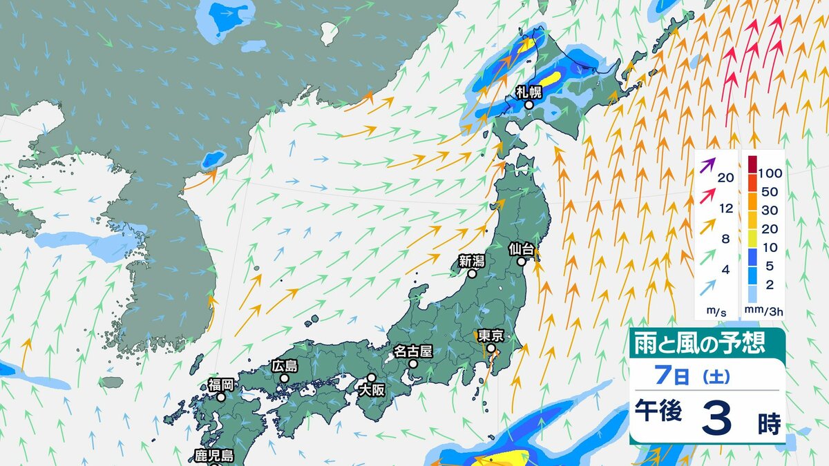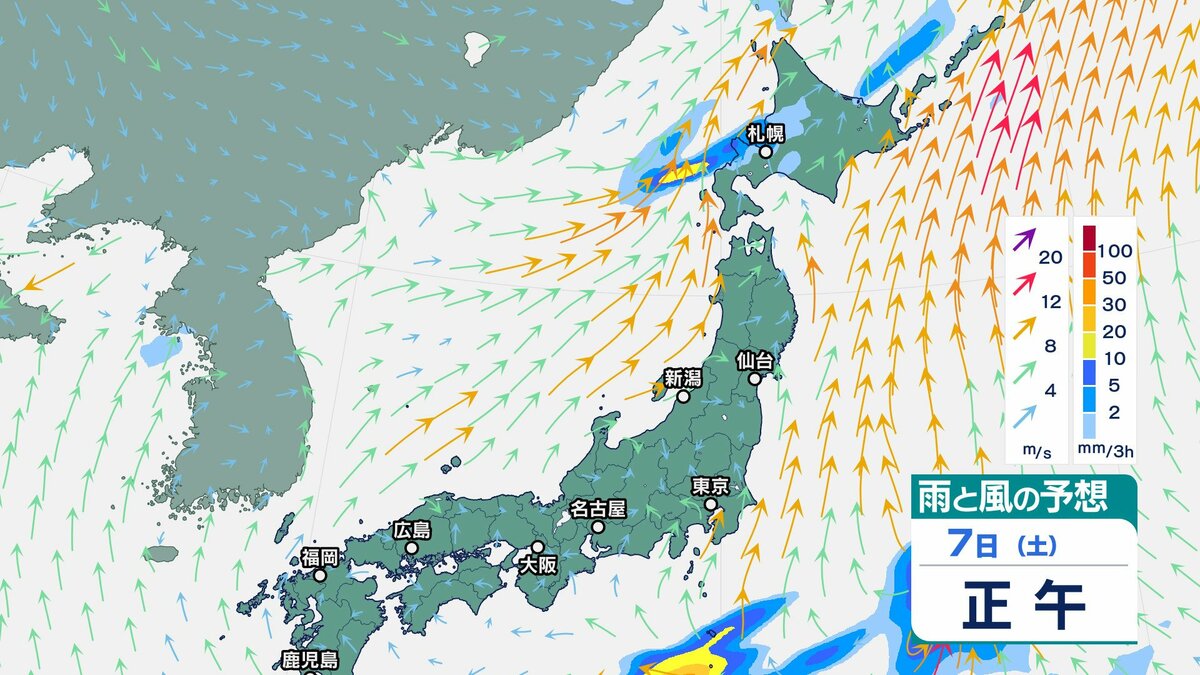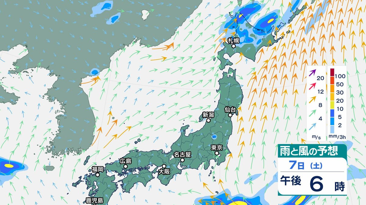 また、北日本では低気圧や前線と日本の南の高気圧との間で気圧の傾きが大きくなっています。このため、やや強い風や強い風が吹き、波が高くなっている所があります。