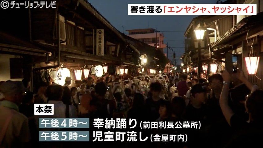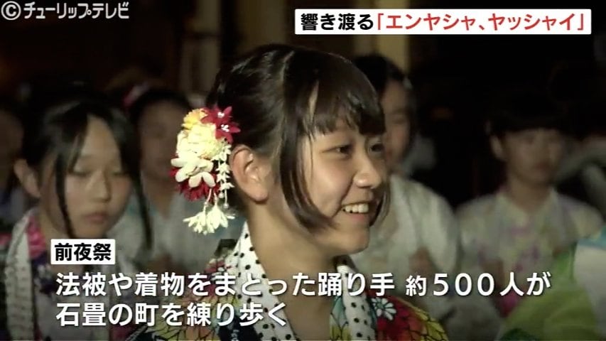 前夜祭が行われた昨夜は、法被や浴衣などをまとった子どもから大人までの踊り手およそ500人が石畳の町を練り歩きました。